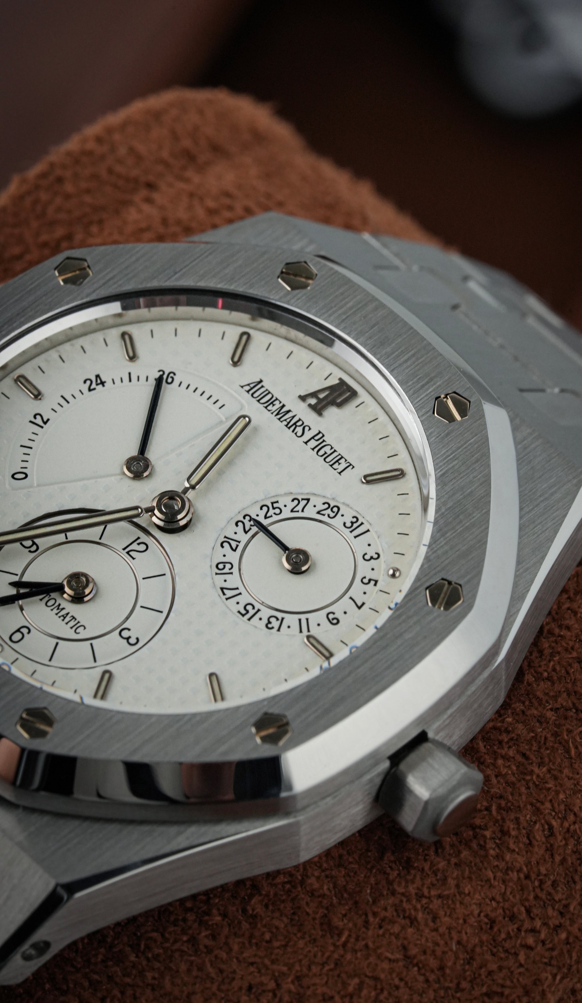 This Audemars Piguet Royal Oak Dual Time Ref. 25730ST stands as a perfect example of refined complication within the legendary Royal Oak platform. The gracefully aged cream-toned white dial adds a unique warmth and charm to an already timeless design. Its balanced proportions, practical features, and iconic presence make this a compelling choice for those seeking a versatile and collectible Royal Oak with added functionality.