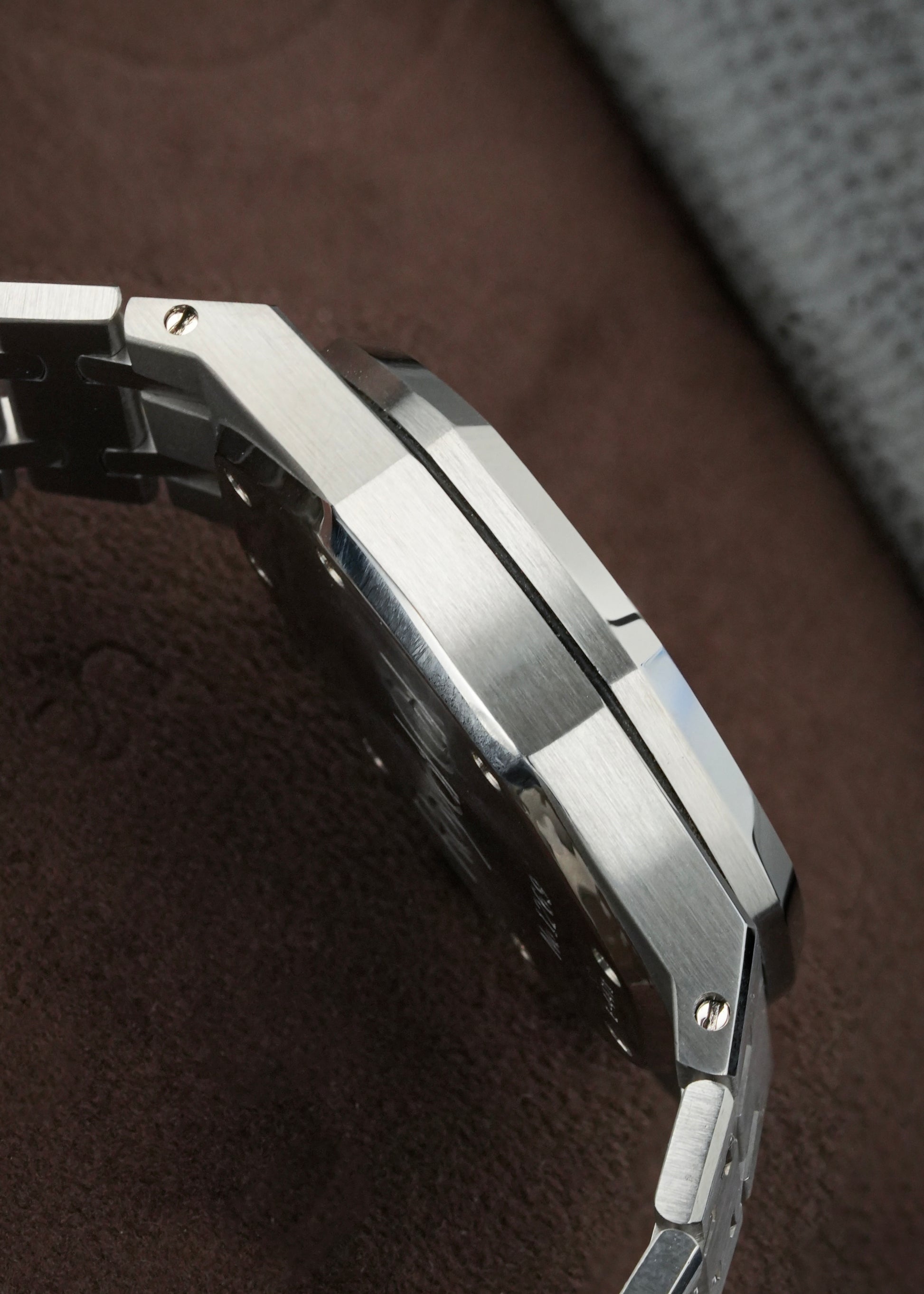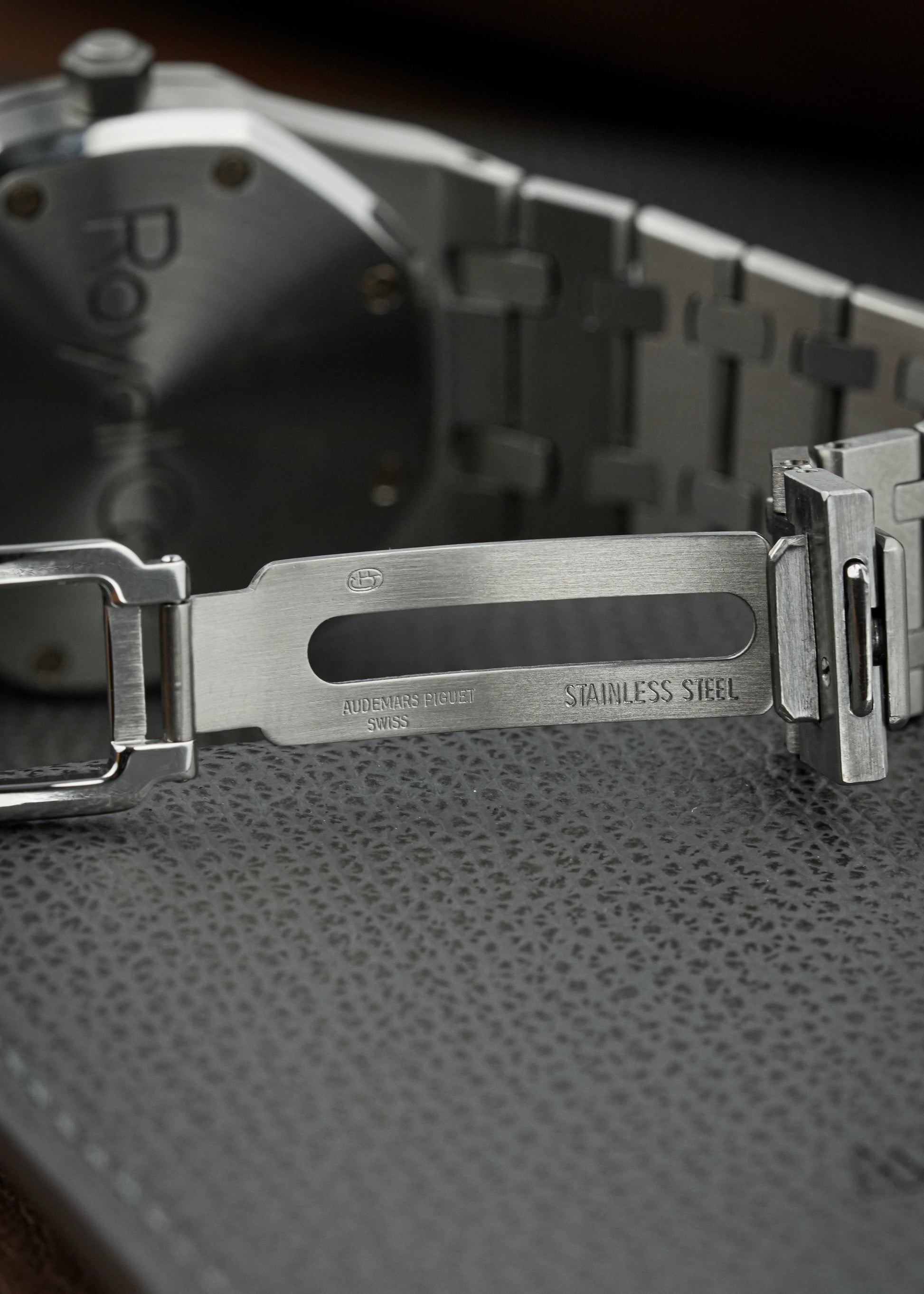 The watch is paired with the original integrated stainless steel Royal Oak bracelet, featuring the signature AP folding clasp. It maintains the iconic mix of brushed and polished finishing that gives the Royal Oak its unmistakable appearance.