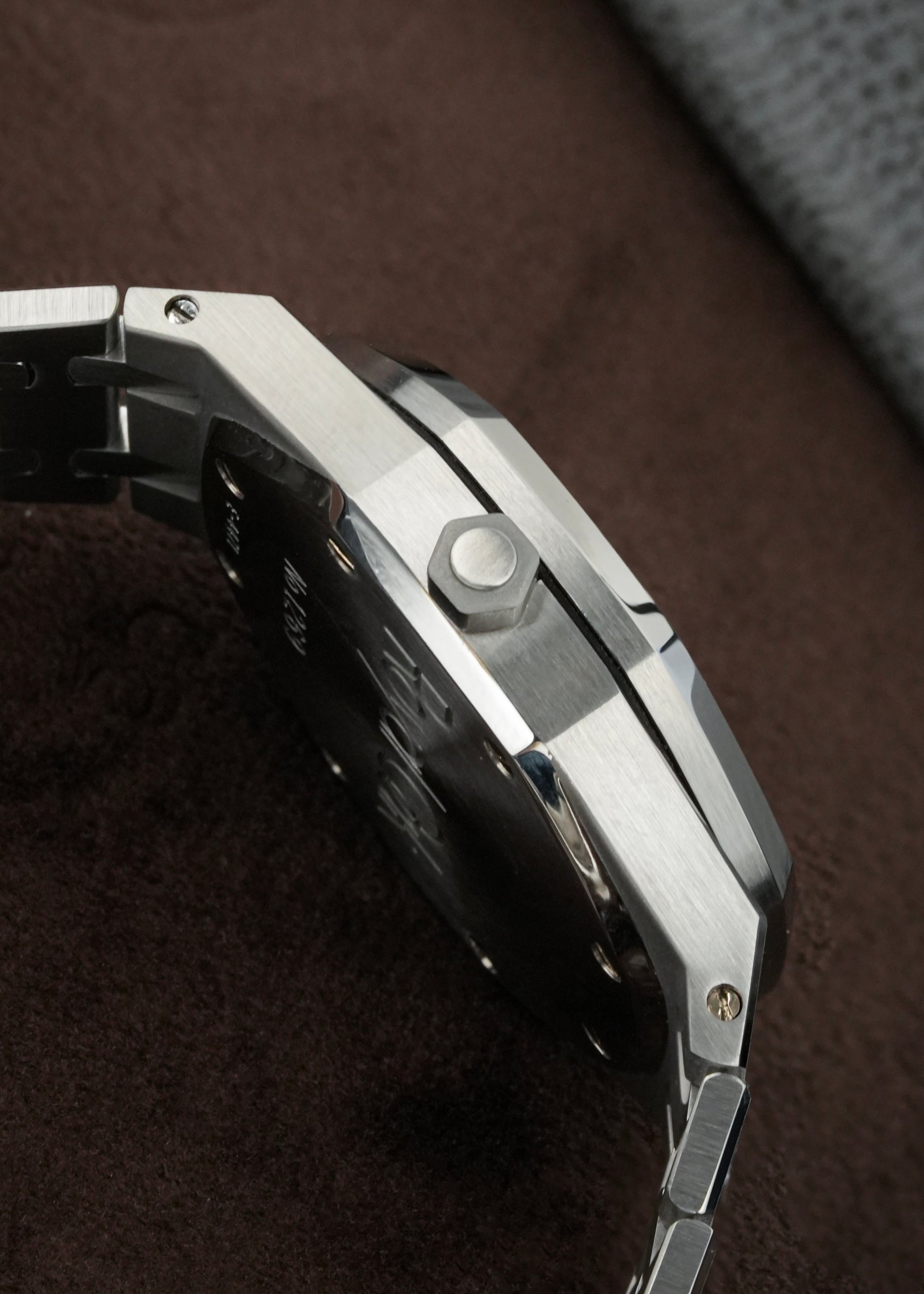 The watch features a 36mm stainless steel case, exhibiting the signature design language of Gérald Genta’s Royal Oak—an octagonal bezel secured by eight white gold screws, a brushed surface with polished bevels, and a slim, elegant profile. The proportions are ideal for those seeking a more classic Royal Oak size that still retains wrist presence.