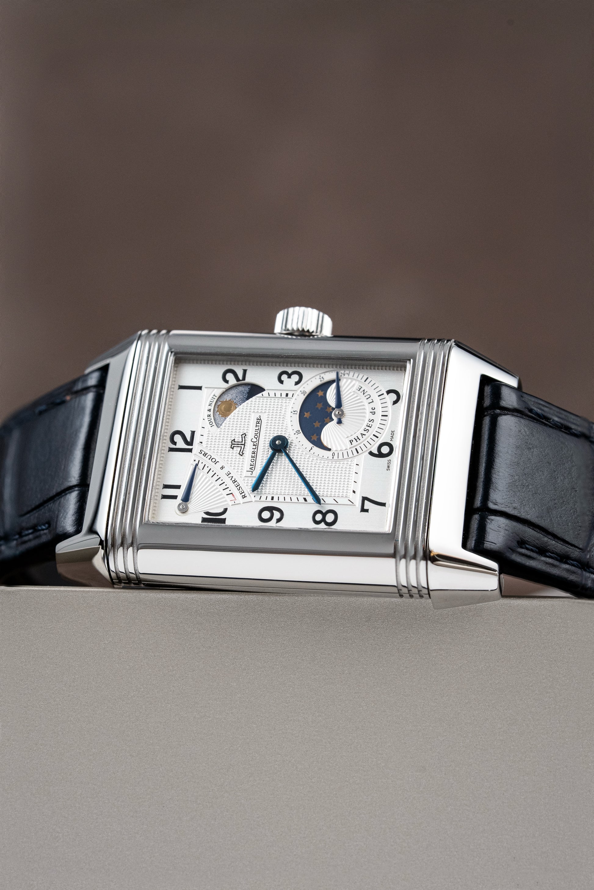 We are pleased to offer for sale a Jaeger-LeCoultre Reverso Grande Sun Moon Ref. 240.8.27, presented here in stainless steel on the original navy blue leather strap.