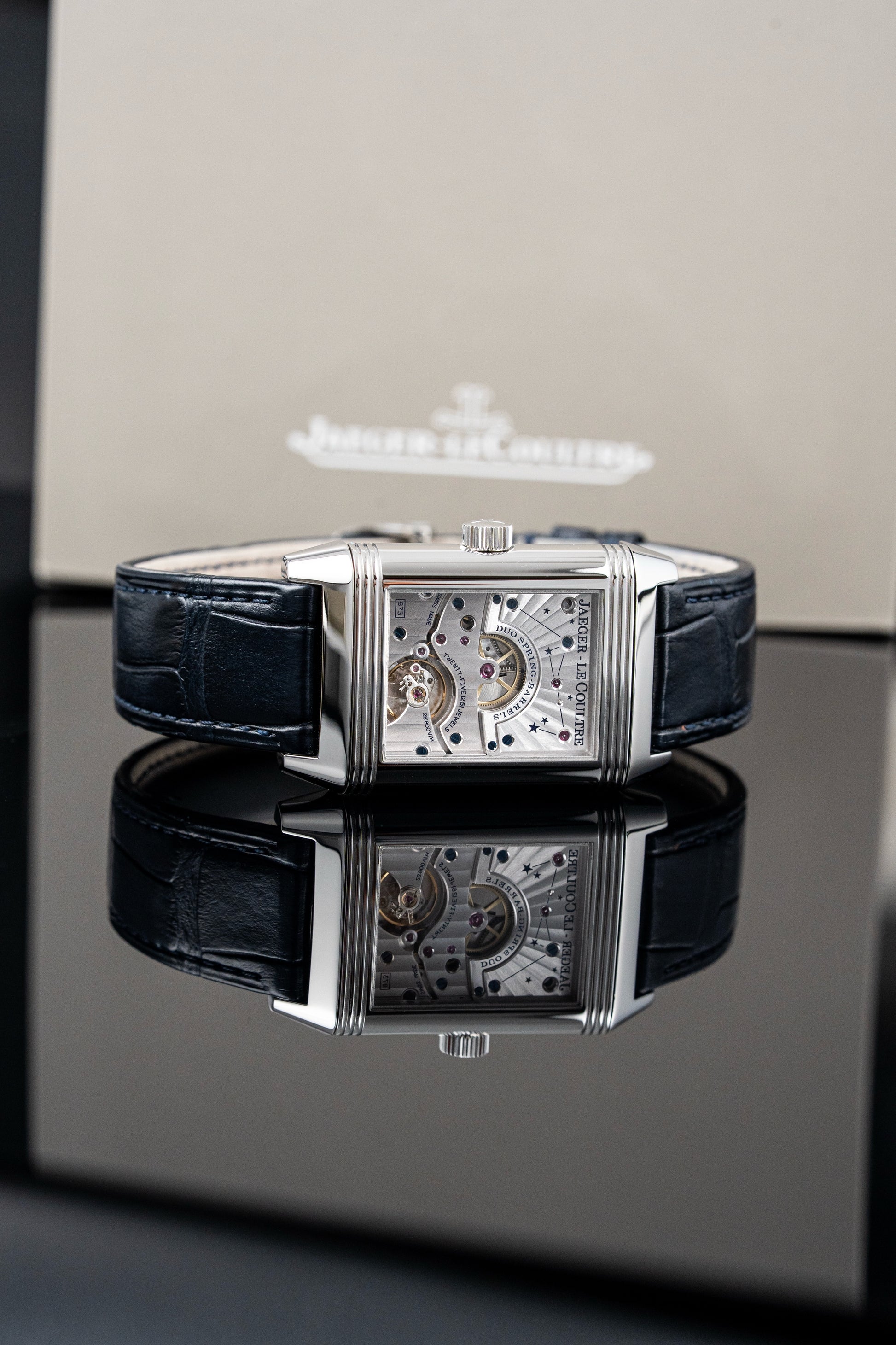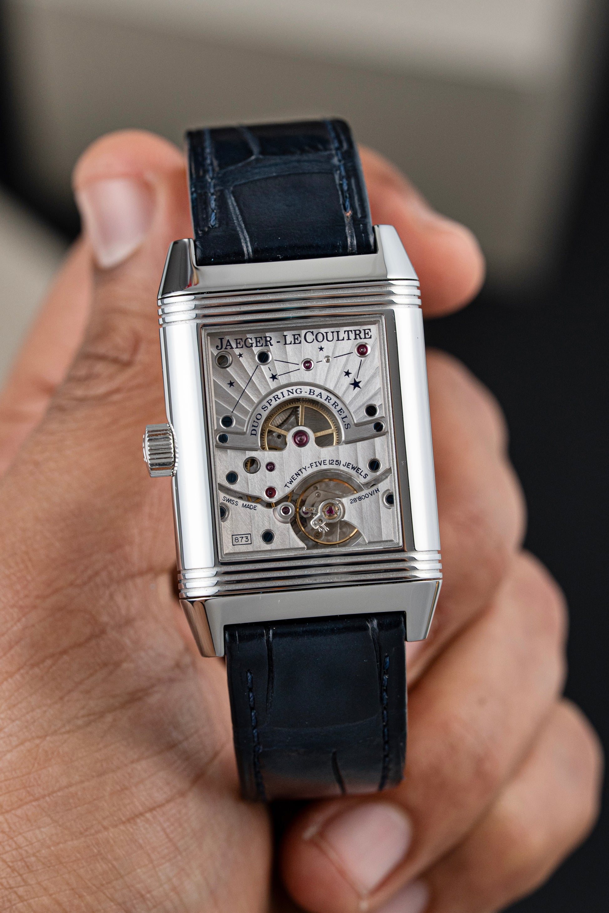 Inside beats the Jaeger-LeCoultre Caliber 873, a hand-wound mechanical movement with an 8-day power reserve, day/night indicator, moonphase, and small seconds. True to the maison’s standards, the movement is meticulously finished and fully integrated within the reversible construction, driving complications on both sides with remarkable precision.