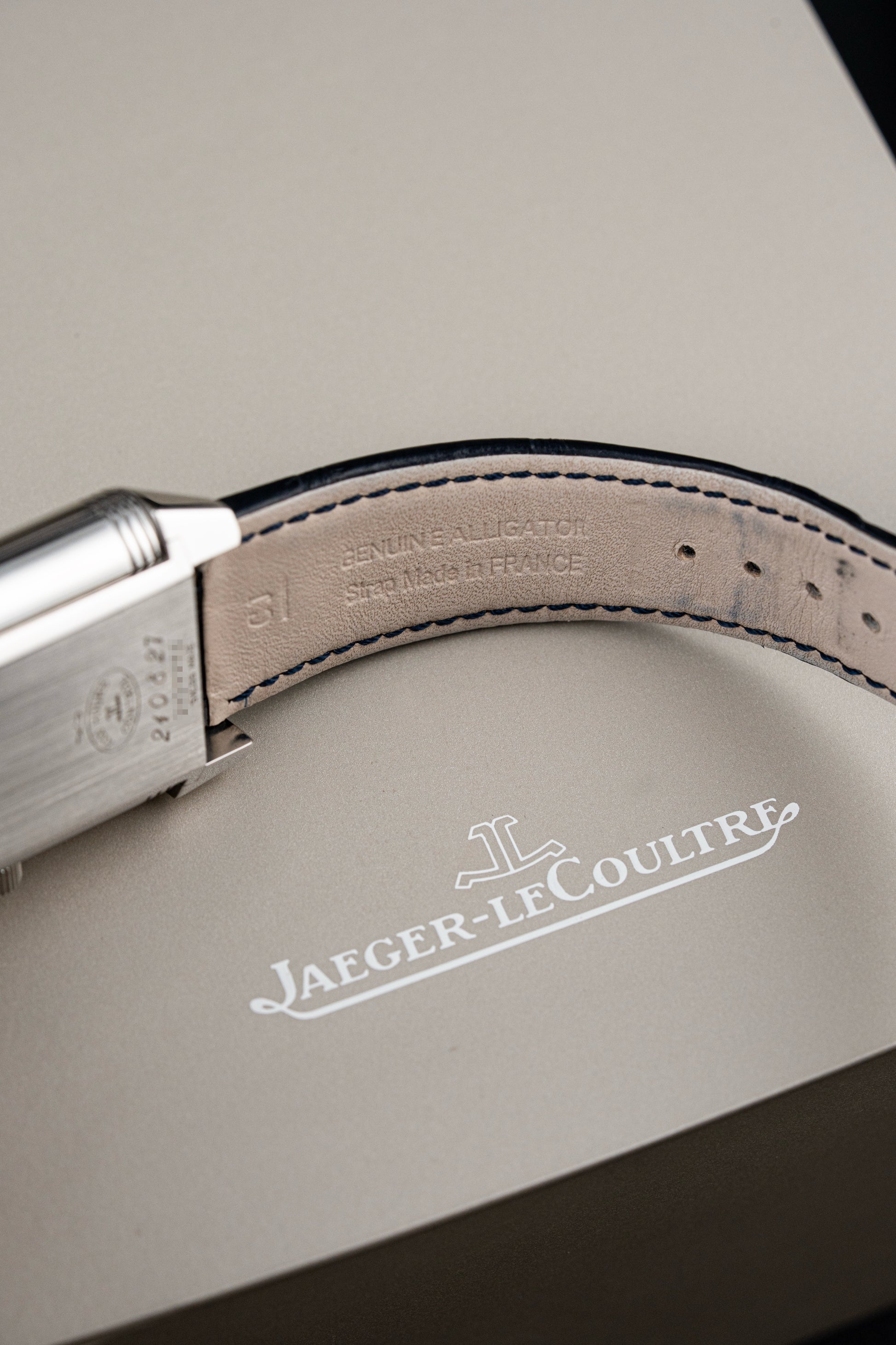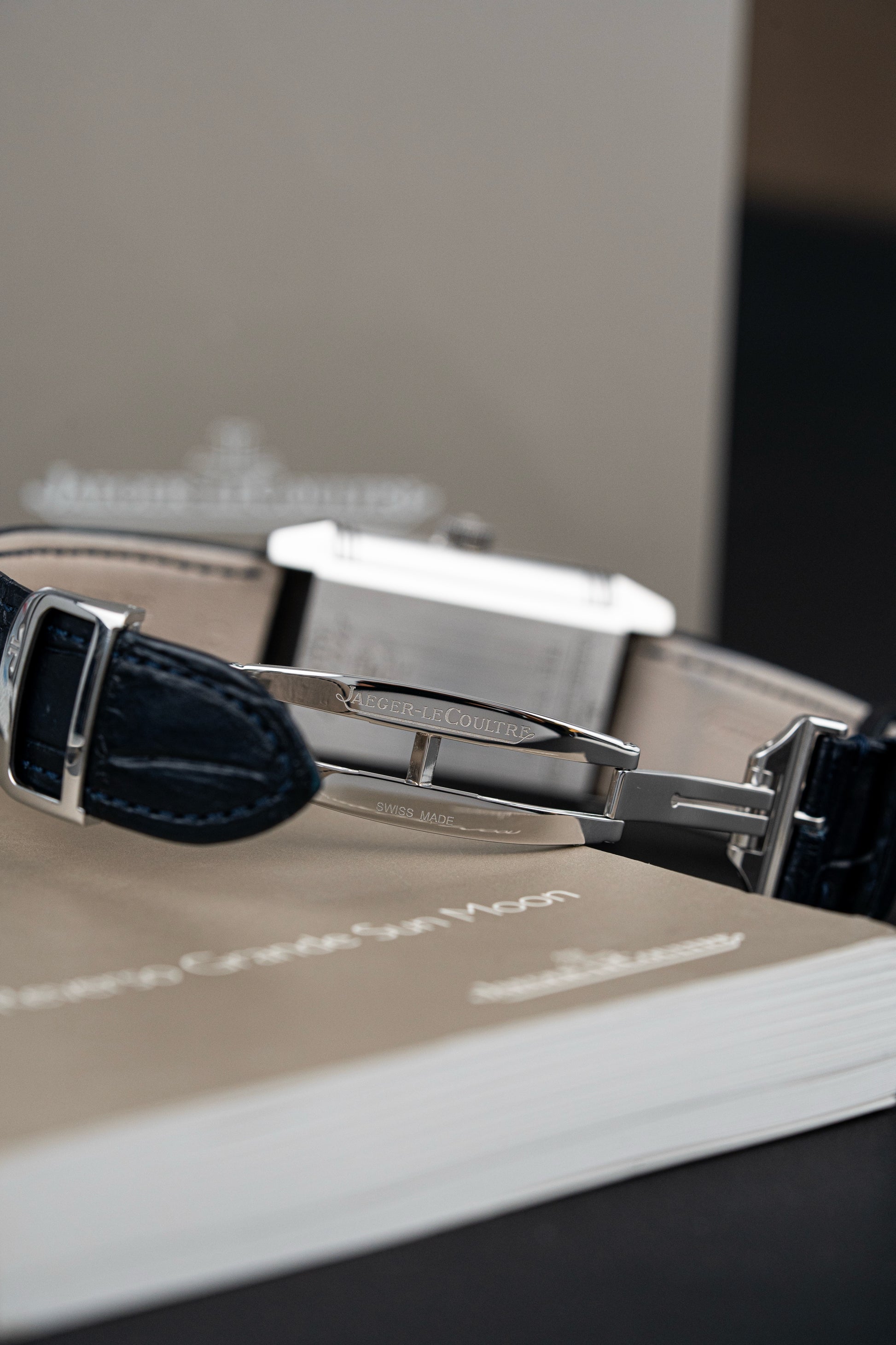 The watch is fitted with a navy blue Jaeger-LeCoultre leather strap, complementing the steel case with a touch of understated elegance. It fastens with a Jaeger-LeCoultre stainless steel folding clasp, ensuring both security and comfort on the wrist.
