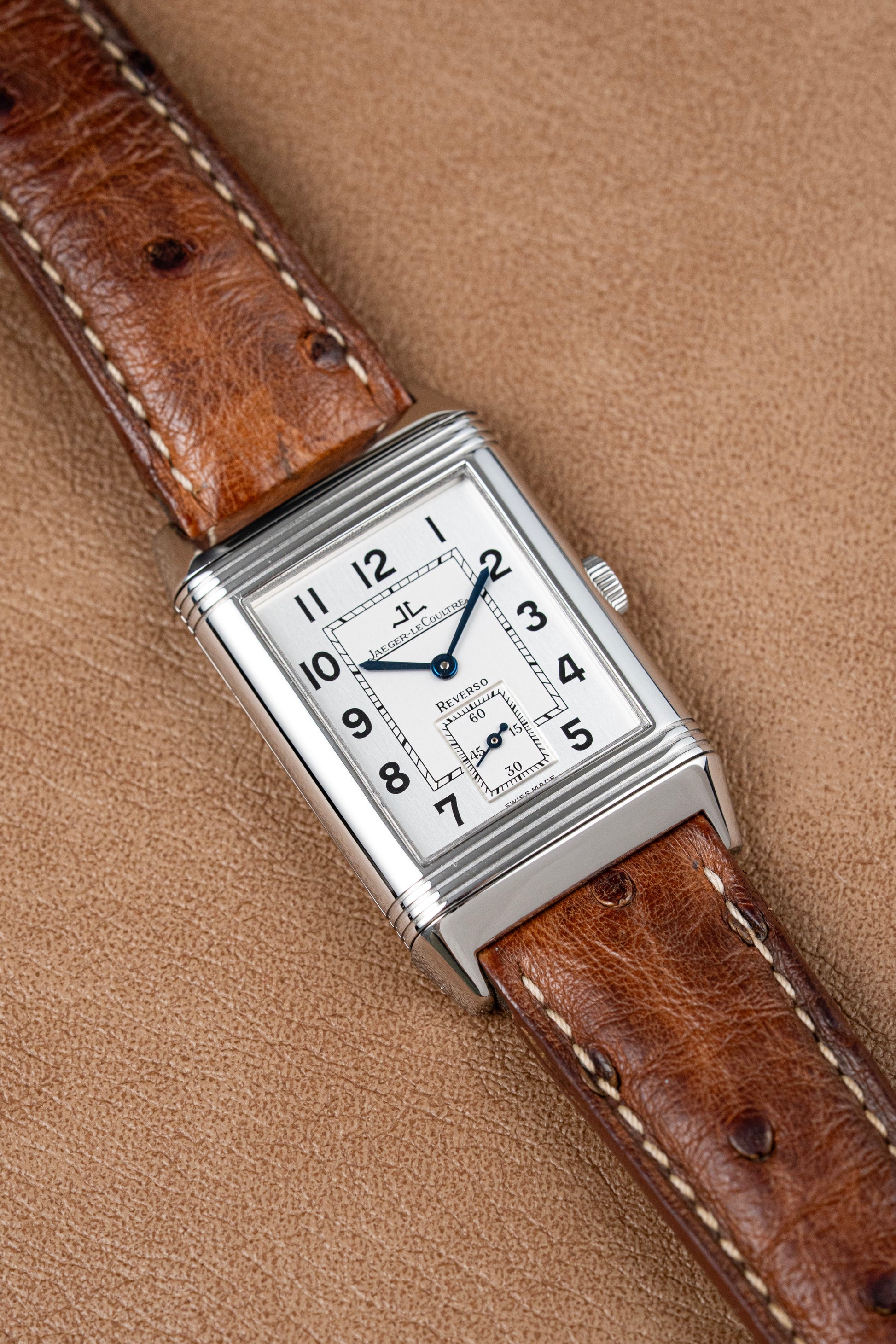 This example is elegantly paired with a brown ostrich leather strap, adding warmth and texture to the polished steel case. The natural grain of the strap complements the Reverso’s Art Deco lines while enhancing its vintage charm. It is fitted with a Jaeger-LeCoultre stainless steel double-fold deployant clasp, ensuring both security and comfort on the wrist.