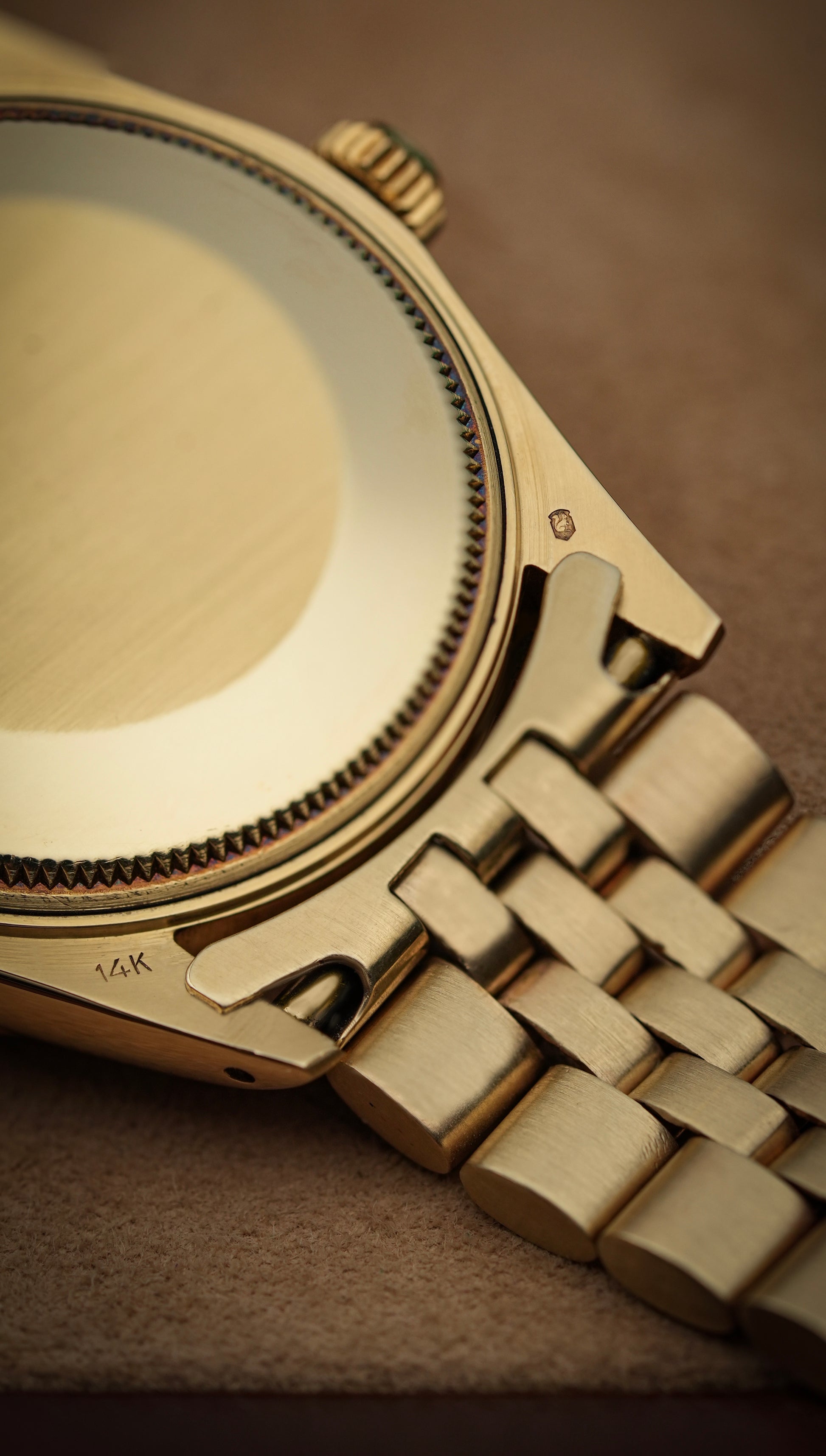 Crafted in 14k yellow gold, the 34mm case remains in excellent condition, showcasing sharp lines and a rich vintage luster. The defining feature of the 1501 reference is its engine-turned bezel, offering a sporty yet refined aesthetic that sets it apart from more common fluted or smooth bezel Rolex models.