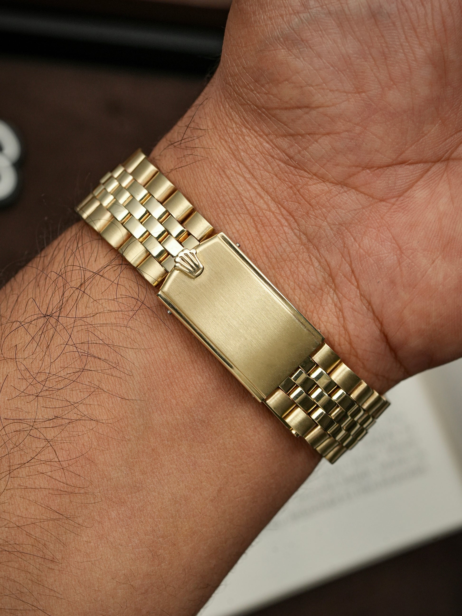 Paired with the original U.S.A.-made Jubilee bracelet in 14k yellow gold, this example features a folding box clasp with the Rolex coronet. The bracelet is in excellent vintage condition and retains strong definition across the links.