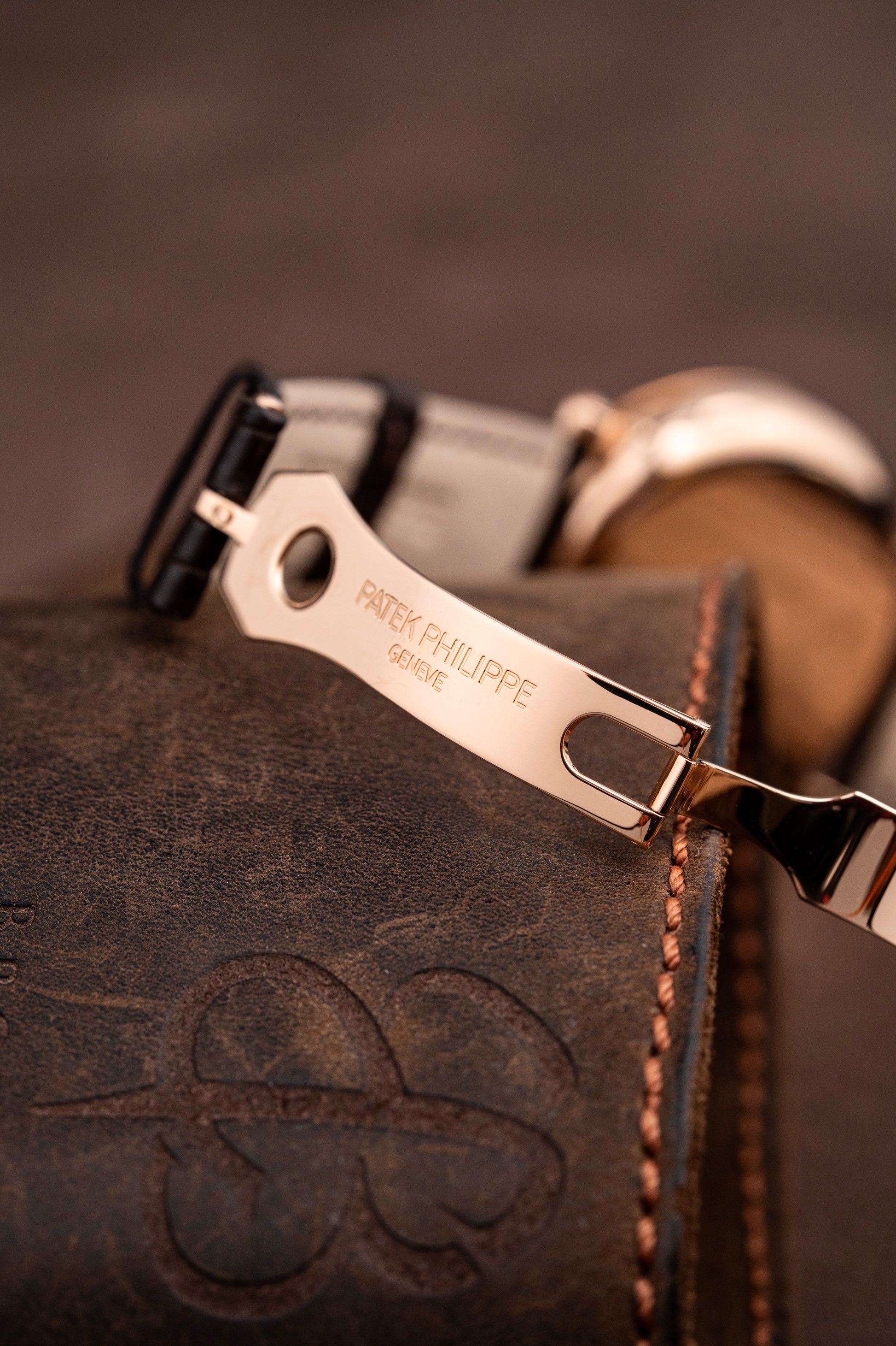 This example is fitted with a brand new genuine Patek Philippe hand-stitched leather strap, secured by the original 18k rose gold Patek Philippe folding clasp. The combination of luxurious materials and superb comfort ensures an elegant presence on the wrist.