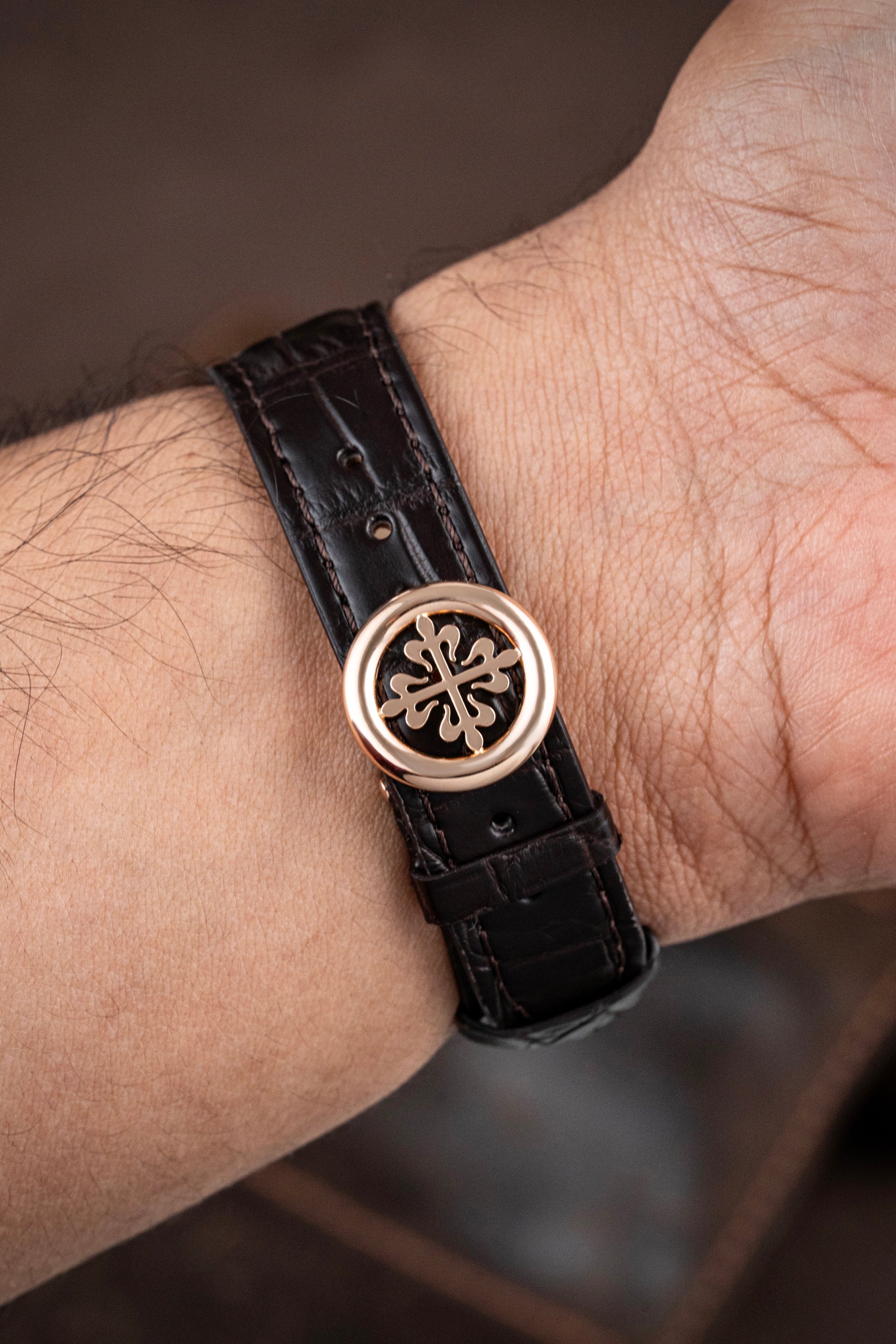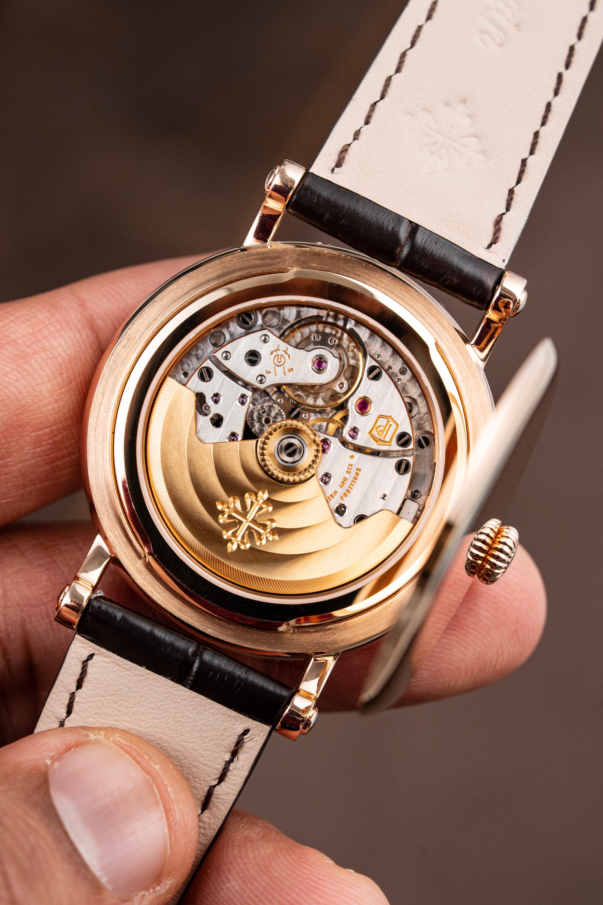 Crafted from 18k rose gold, the 38mm officer-style case showcases Patek Philippe’s signature blend of refinement and character. The hinged caseback reveals the meticulously finished Caliber 324 S QR automatic movement beneath a sapphire crystal display back.