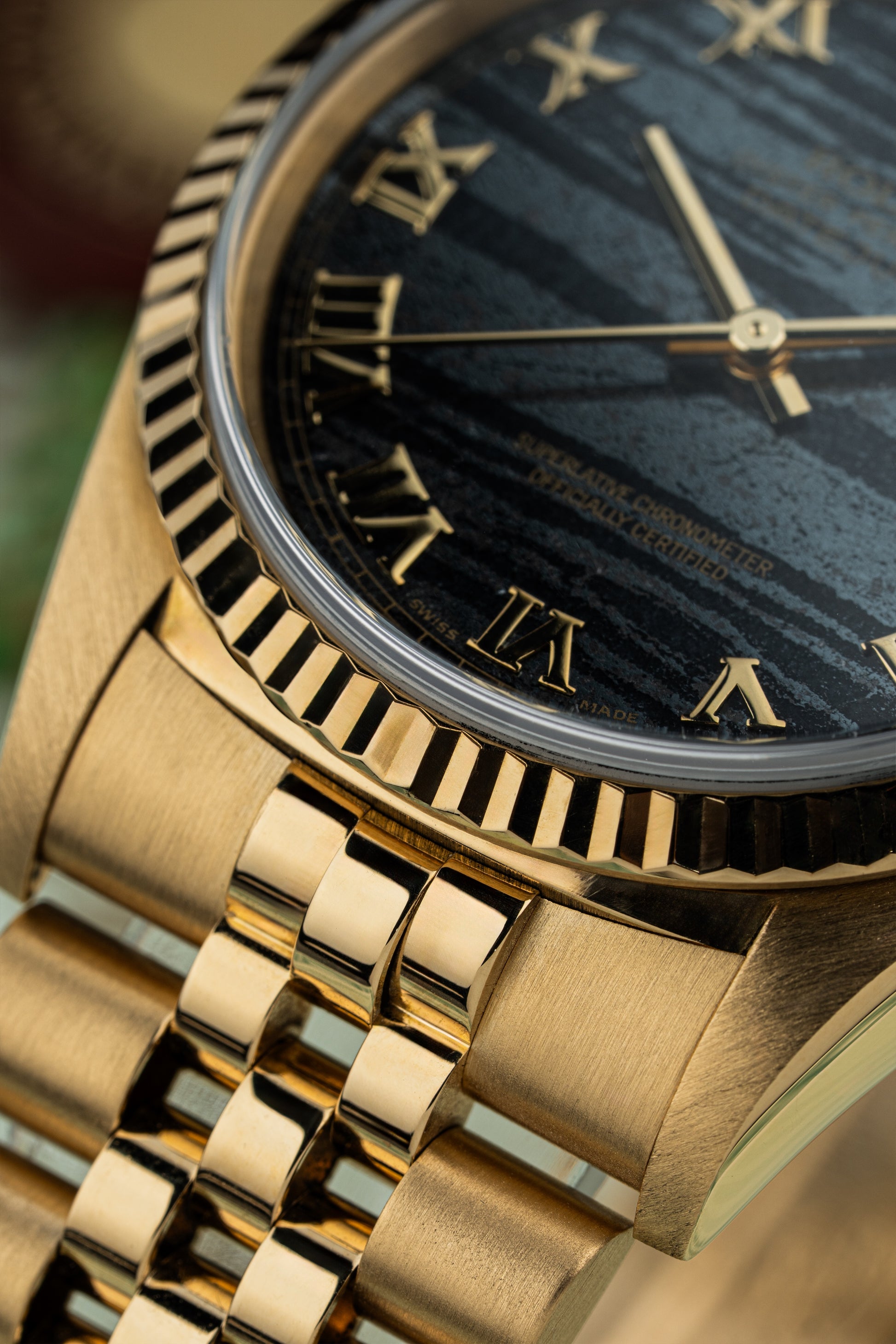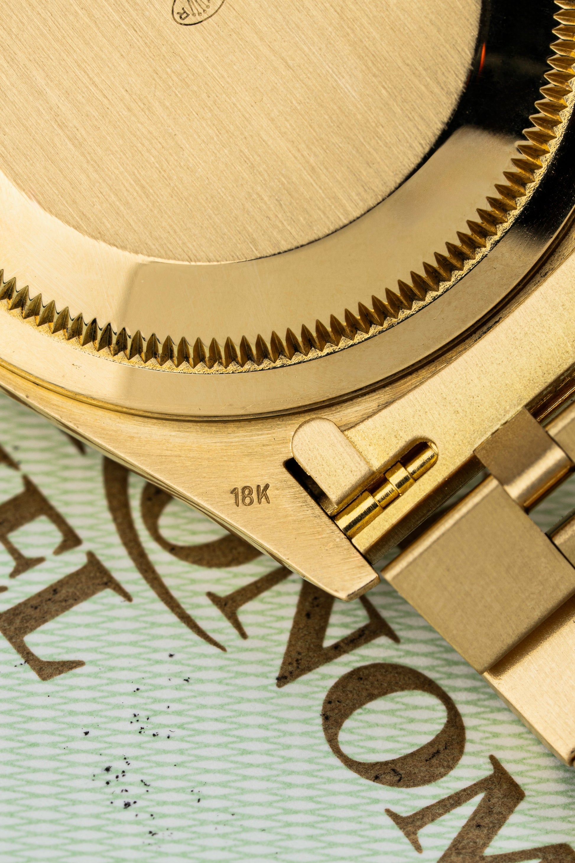 The 16238 features a classic oyster case crafted in solid 18k yellow gold, providing a warm, timeless look, which has long been associated with luxury and prestige. The case has a 36mm diameter case size which is the classic Datejust size, making it versatile for both men and women. It strikes the perfect balance between elegance and presence, fitting well on a wide range of wrist sizes.