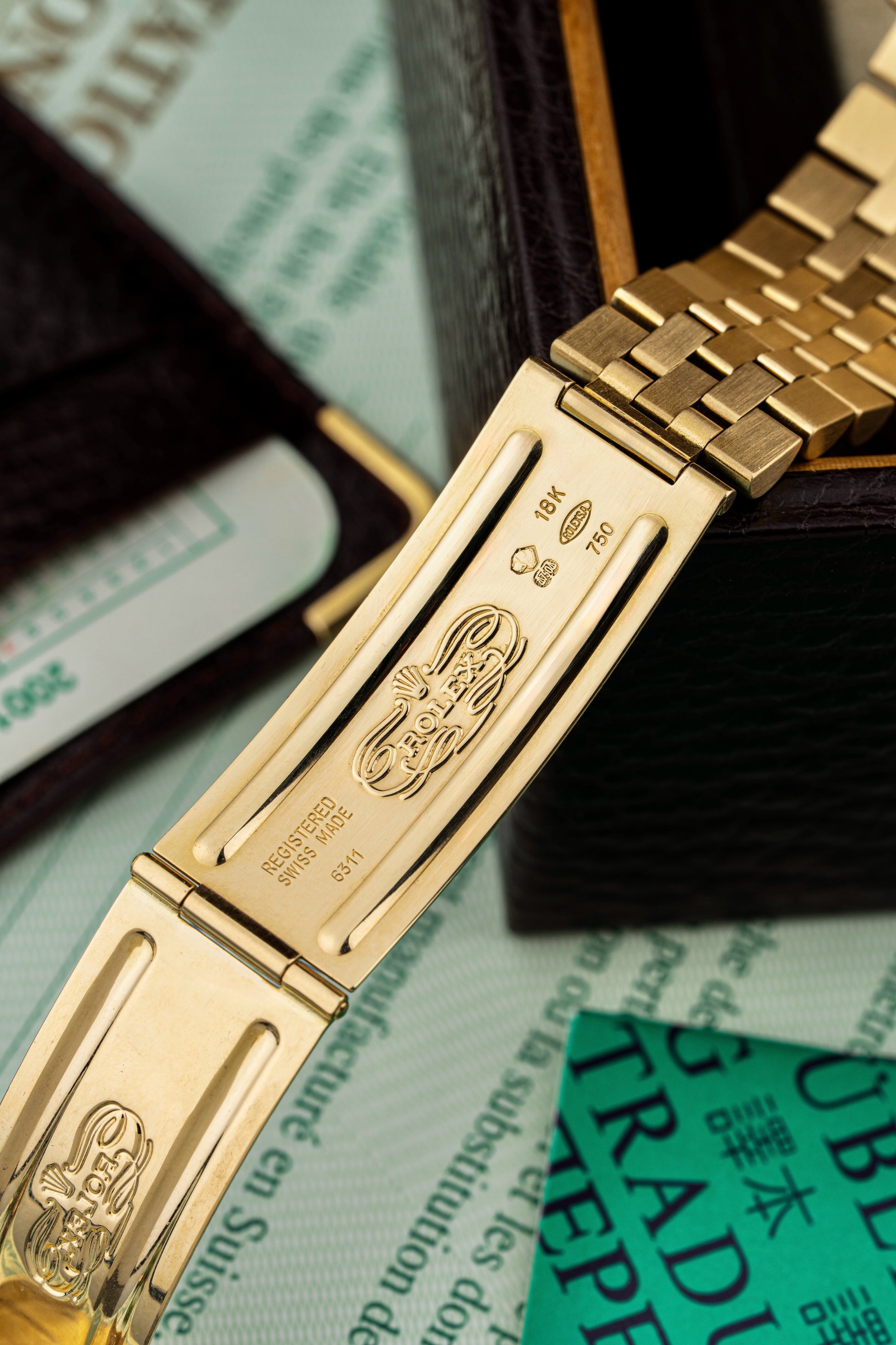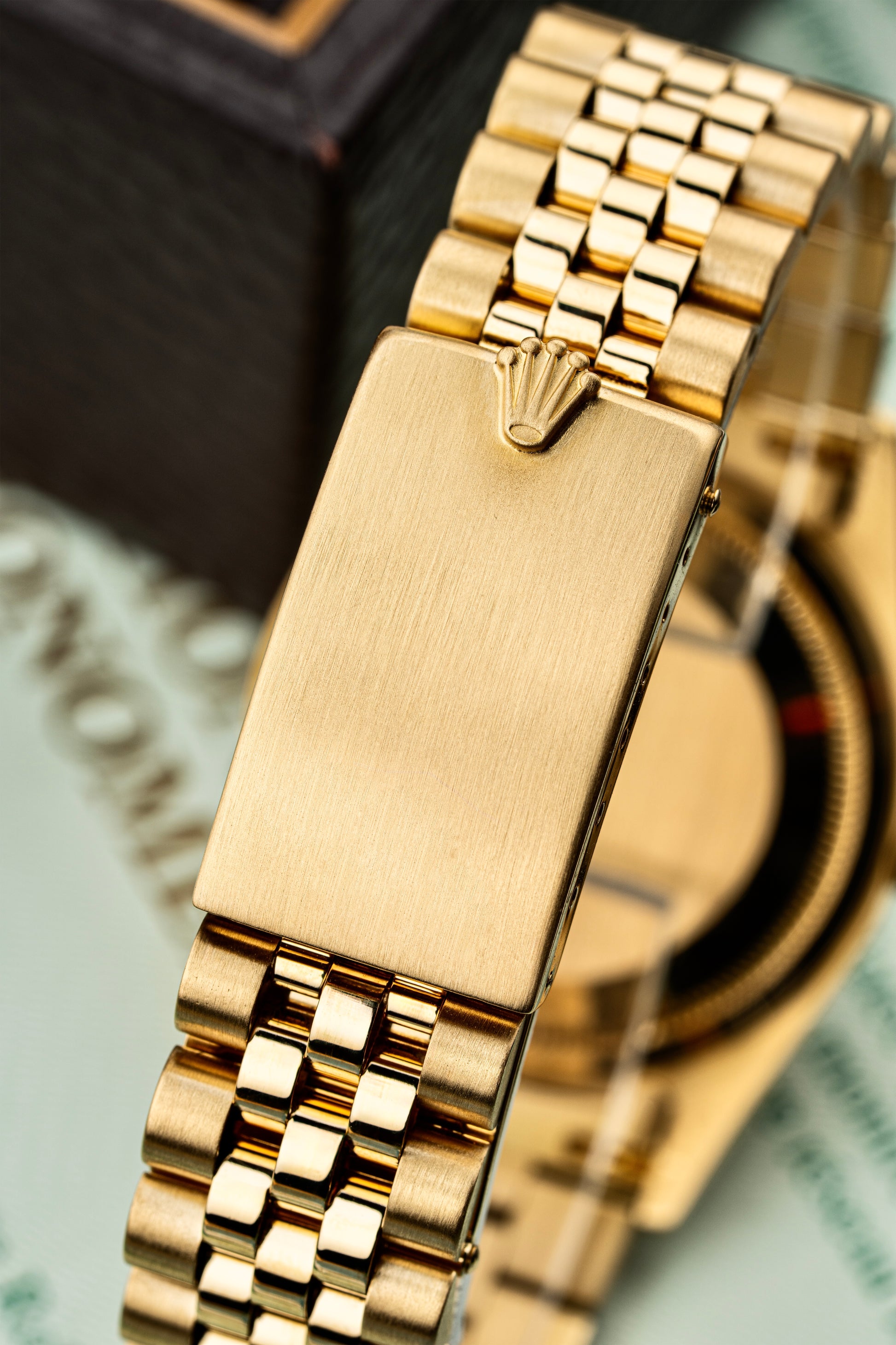 The oyster case is paired with an iconic 18k yellow gold Jubilee bracelet. The bracelet is fitted with the classical box clasp which adds a strong vintage characteristic to the watch and reflects a golden era of watchmaking.