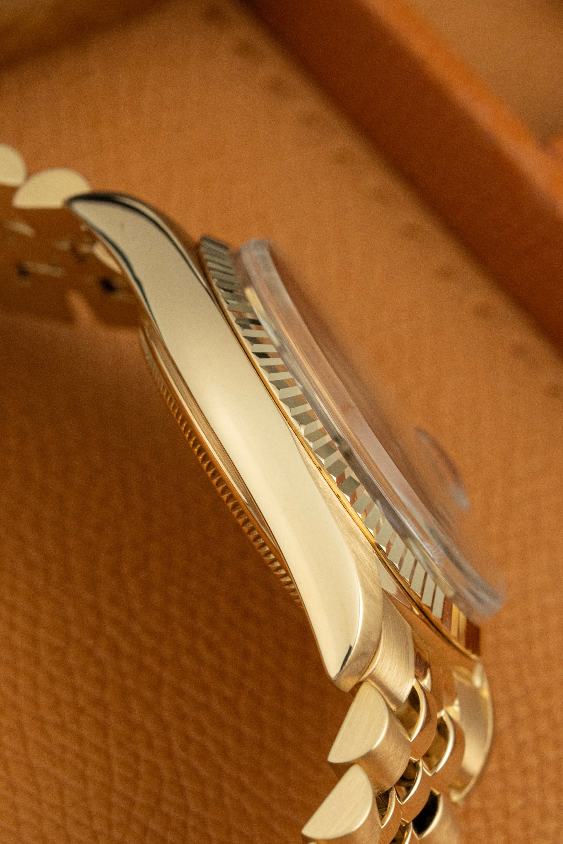 Crafted entirely in 18k yellow gold, the 36mm case remains sharp and well-defined, with strong lugs and clean edges that testify to its excellent condition. The signature fluted bezel adds contrast and brilliance, catching the light and framing the dial elegantly.