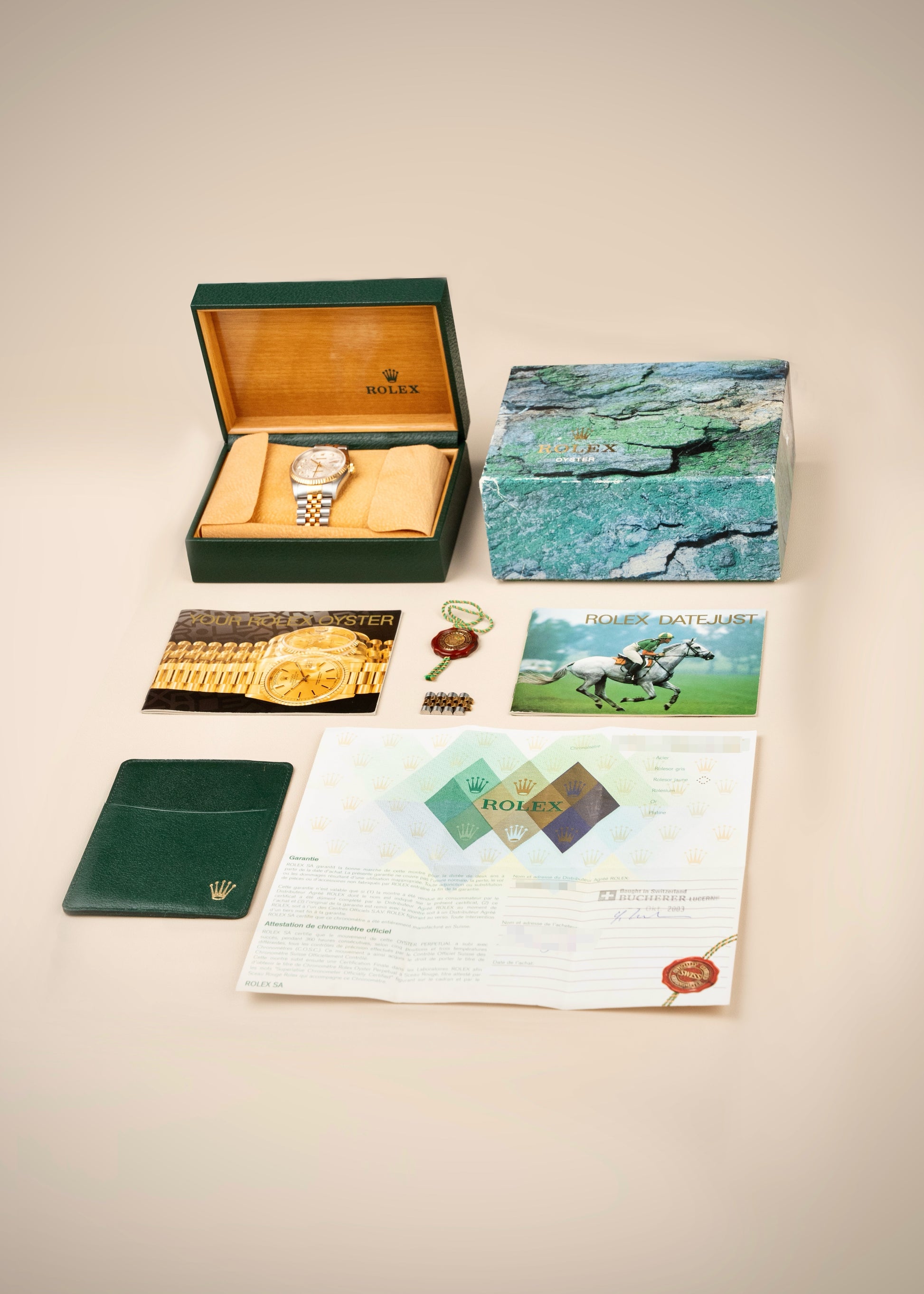 This particular example, produced in 2003, is presented in completely unpolished condition. The lugs, case sides, and fluted bezel remain crisp and sharp, retaining their original factory lines and brushing. Over time, the gold components have developed a beautiful orange-toned oxidation that gives the watch a warm, vintage character that collectors greatly admire.