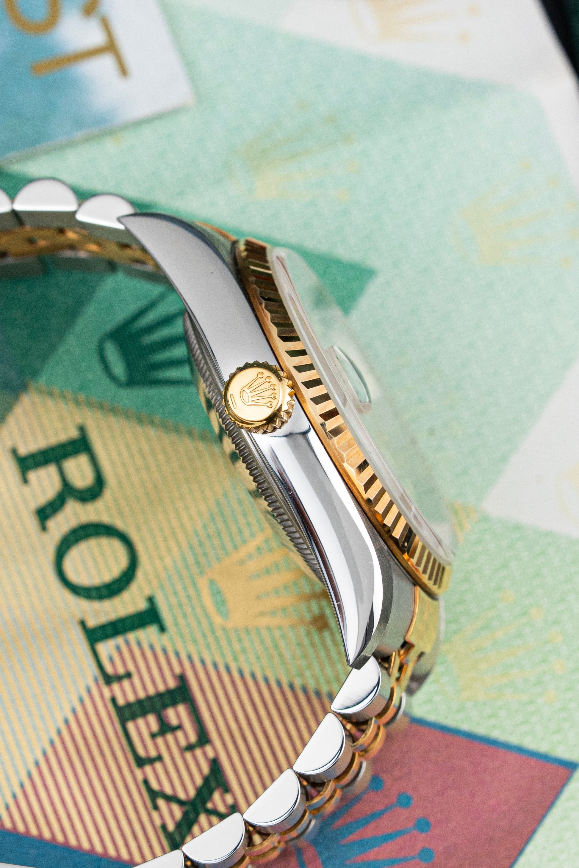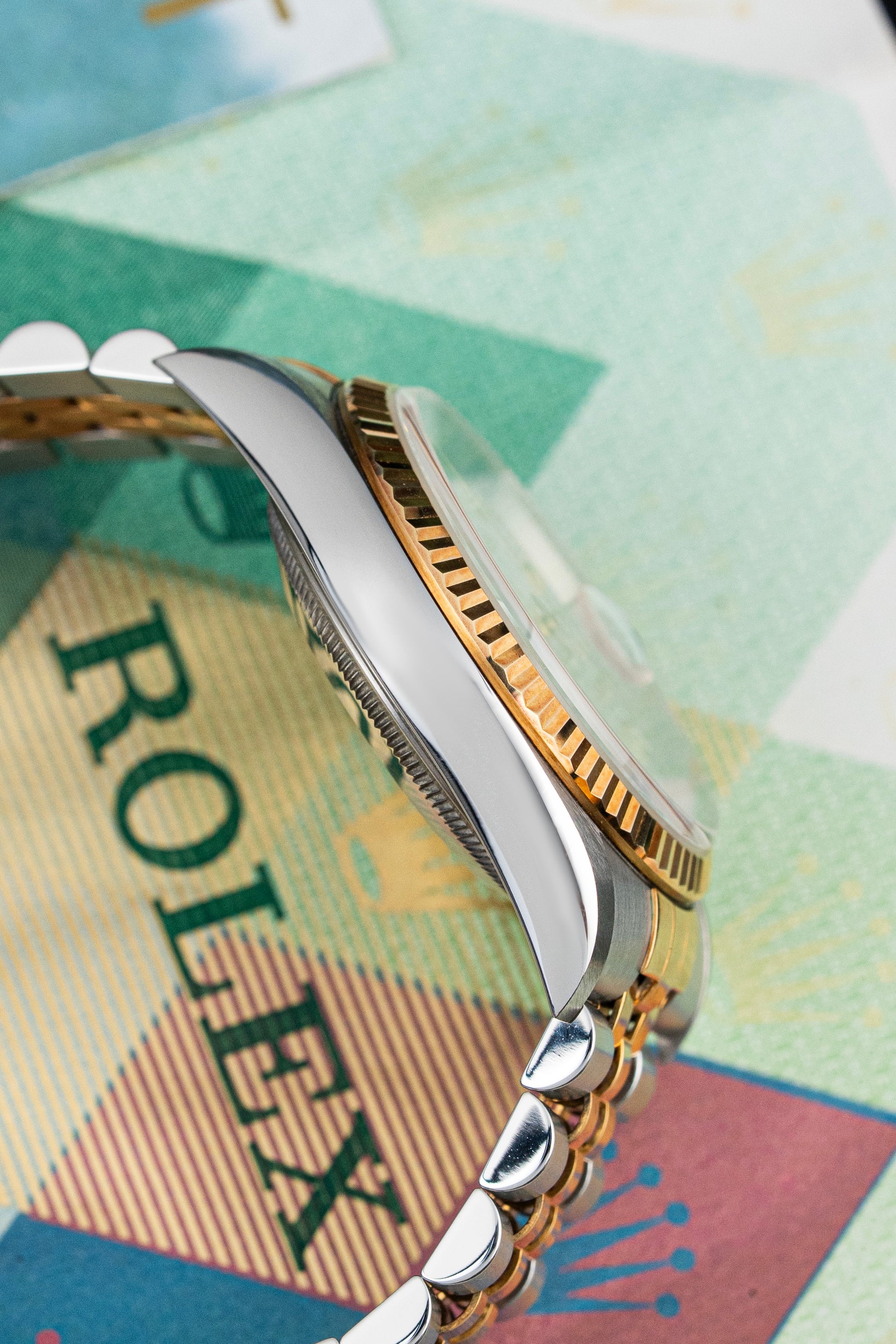 The 36mm Oyster case, made from stainless steel and 18k yellow gold, remains unpolished with sharp edges, crisp fluting on the bezel, and strong lugs that show the original finish. The case proportions are perfect for a wide range of wrist sizes, offering a timeless and balanced profile that has become synonymous with the Datejust line. The yellow gold bezel has developed a natural patina, deepening in color to a rich, orange-gold hue that speaks to the watch’s age and originality.