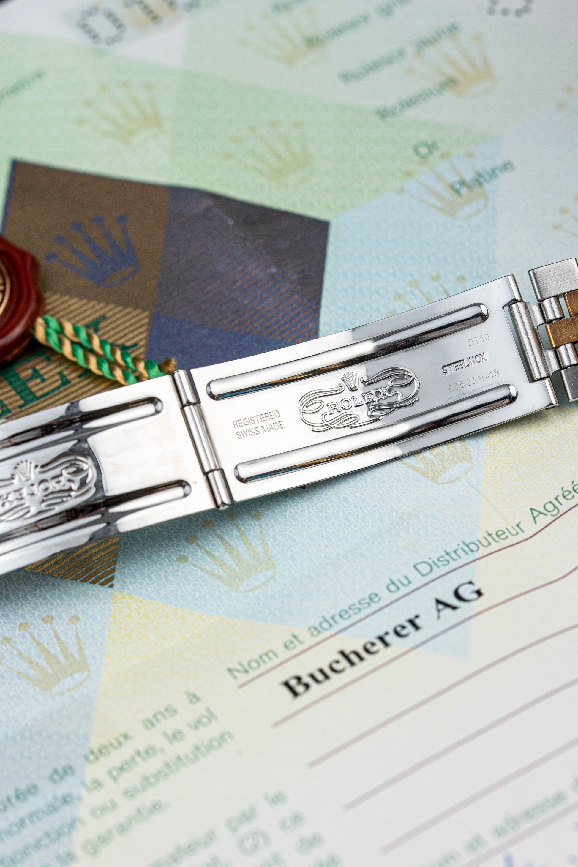 This 16233 is fitted with its original two-tone Jubilee bracelet, composed of stainless steel outer links and 18k yellow gold center links. The bracelet is in excellent condition and features the classic fold-over clasp. Like the bezel and crown, the gold center links have also oxidized to a warm tone, matching the overall character of the piece. The watch comes with four additional spare links, making it easy to size for a variety of wrist sizes.