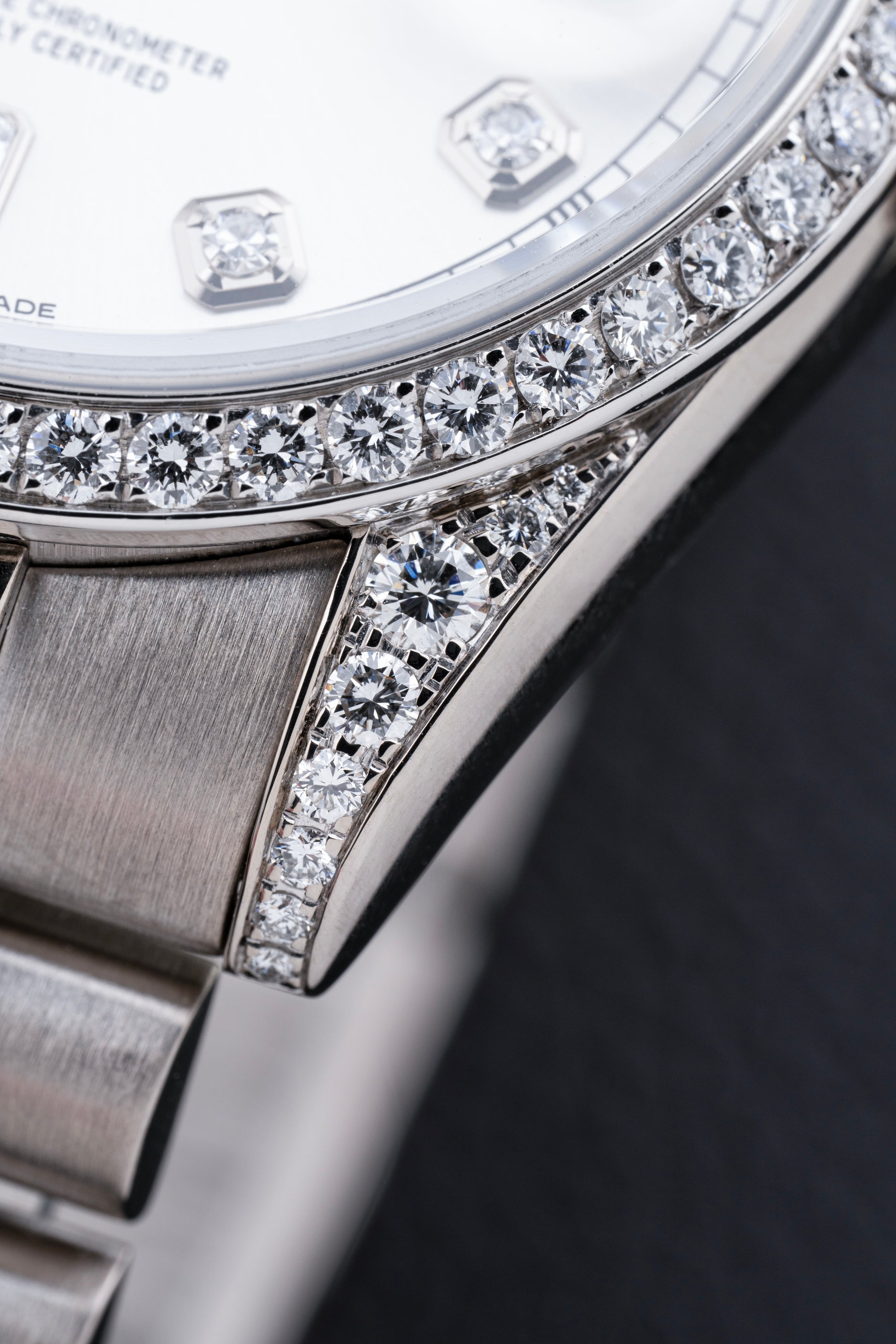 The Rolex Day-Date 118389 in 18k white gold with factory diamond bezel and lugs, mother of pearl diamond dial, and Arabic day-date display is a remarkable timepiece that blends rarity, cultural significance, and refined luxury. Its combination of unique materials and rare dial configuration makes it a highly collectible example of one of Rolex’s most iconic models.