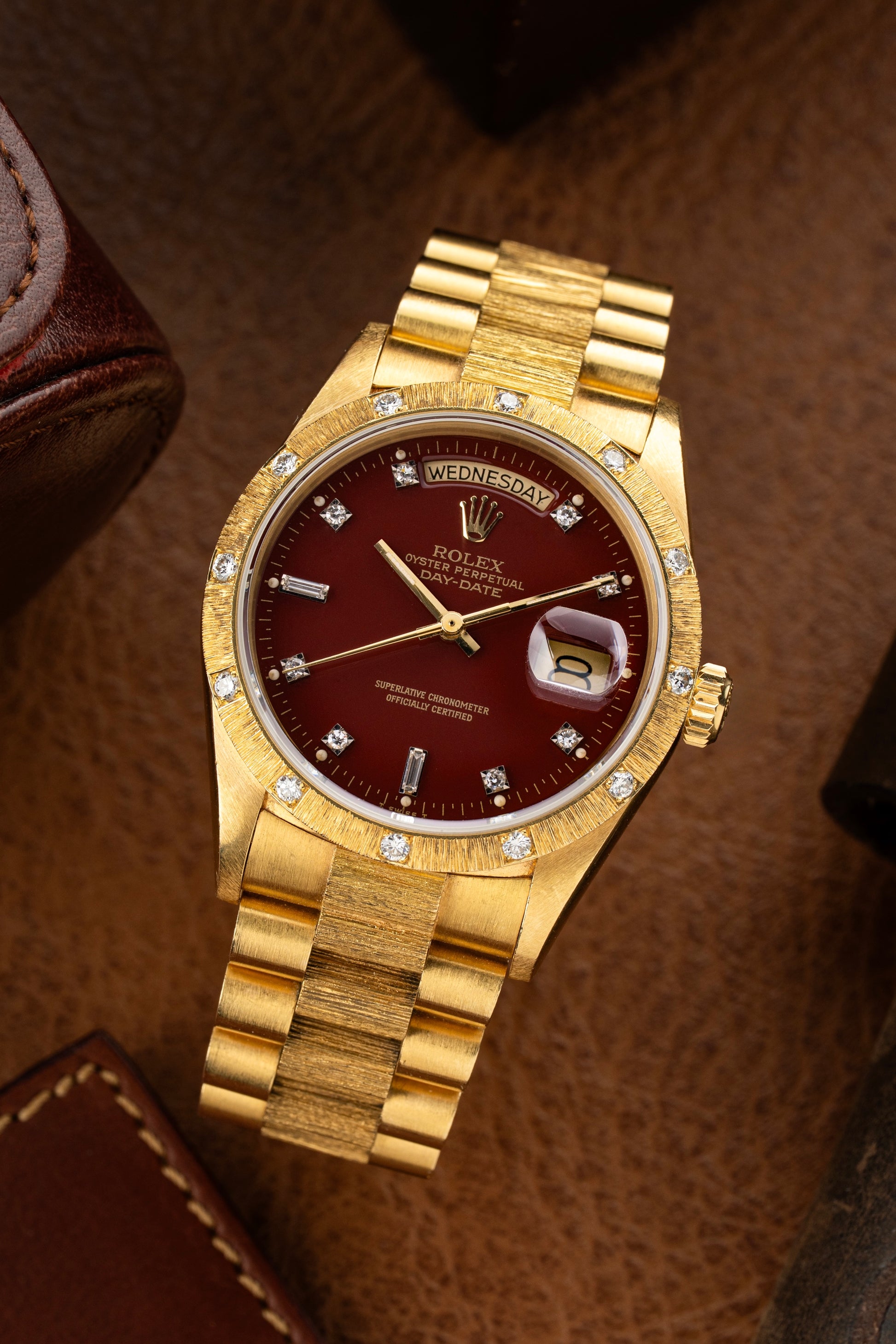 For sale is a Vintage Rolex Day-Date 36mm Ref. 18108 featuring a collectible Oxblood Stella Dial, complimented by the unique bark finish & diamond bezel.