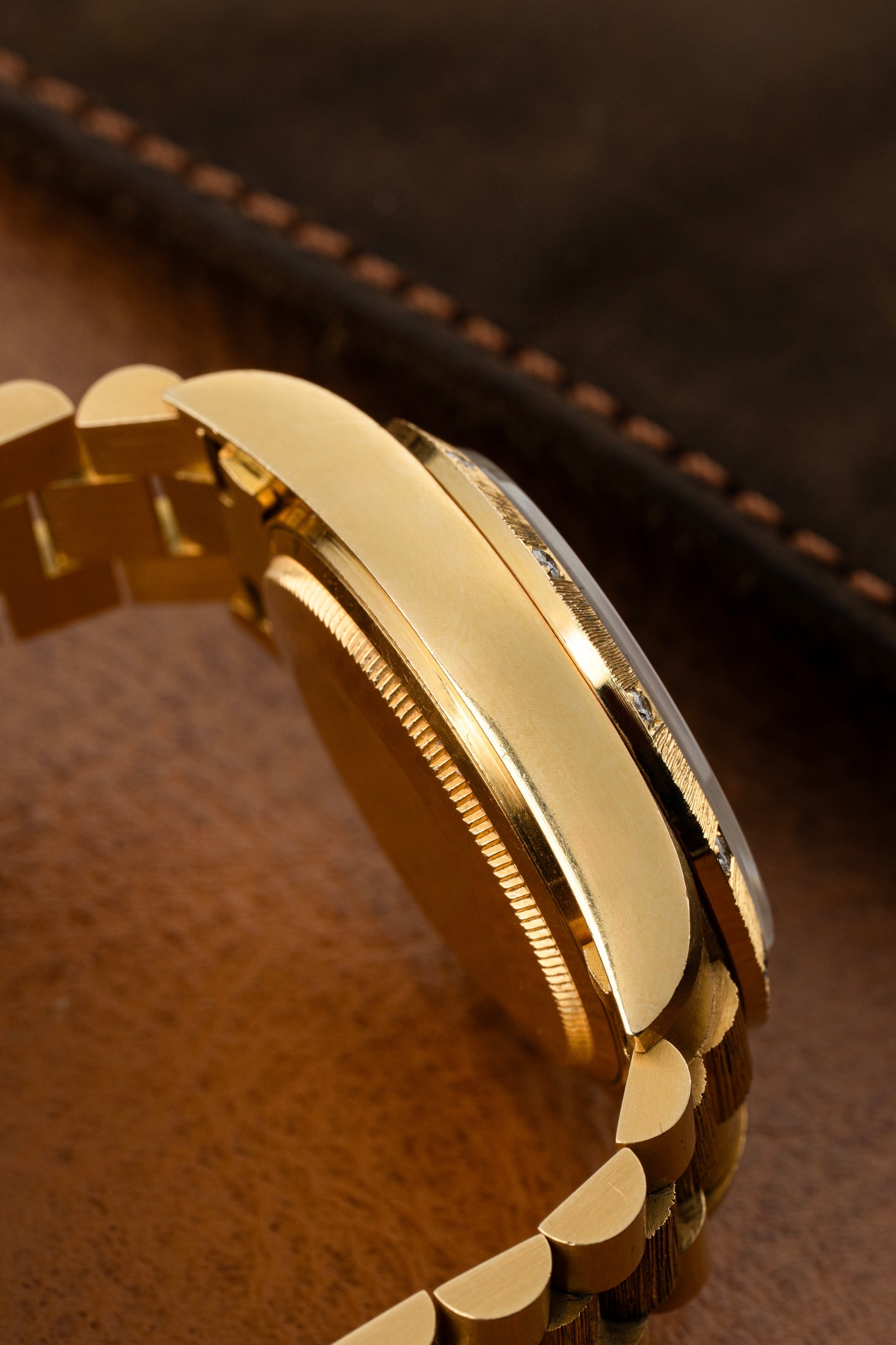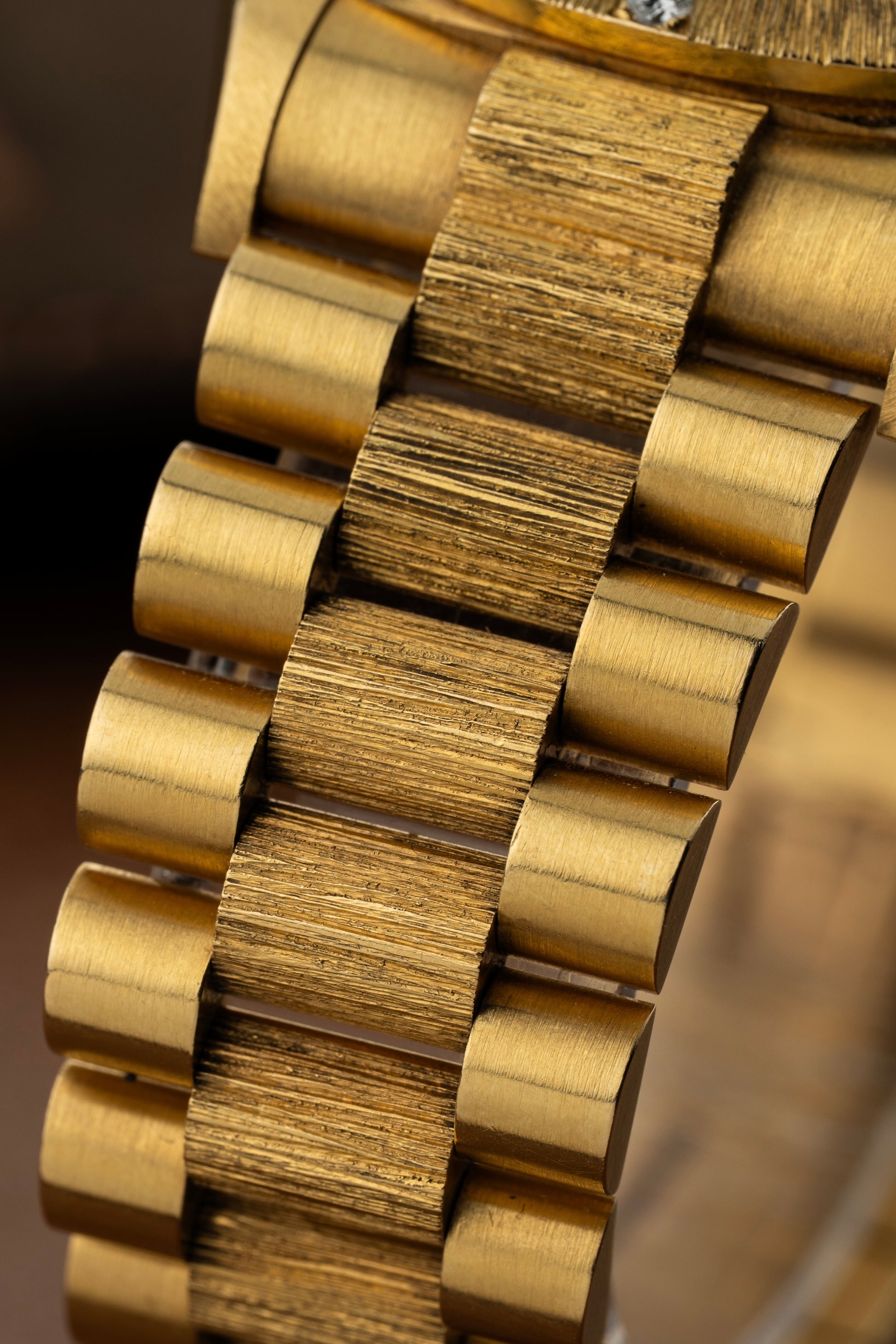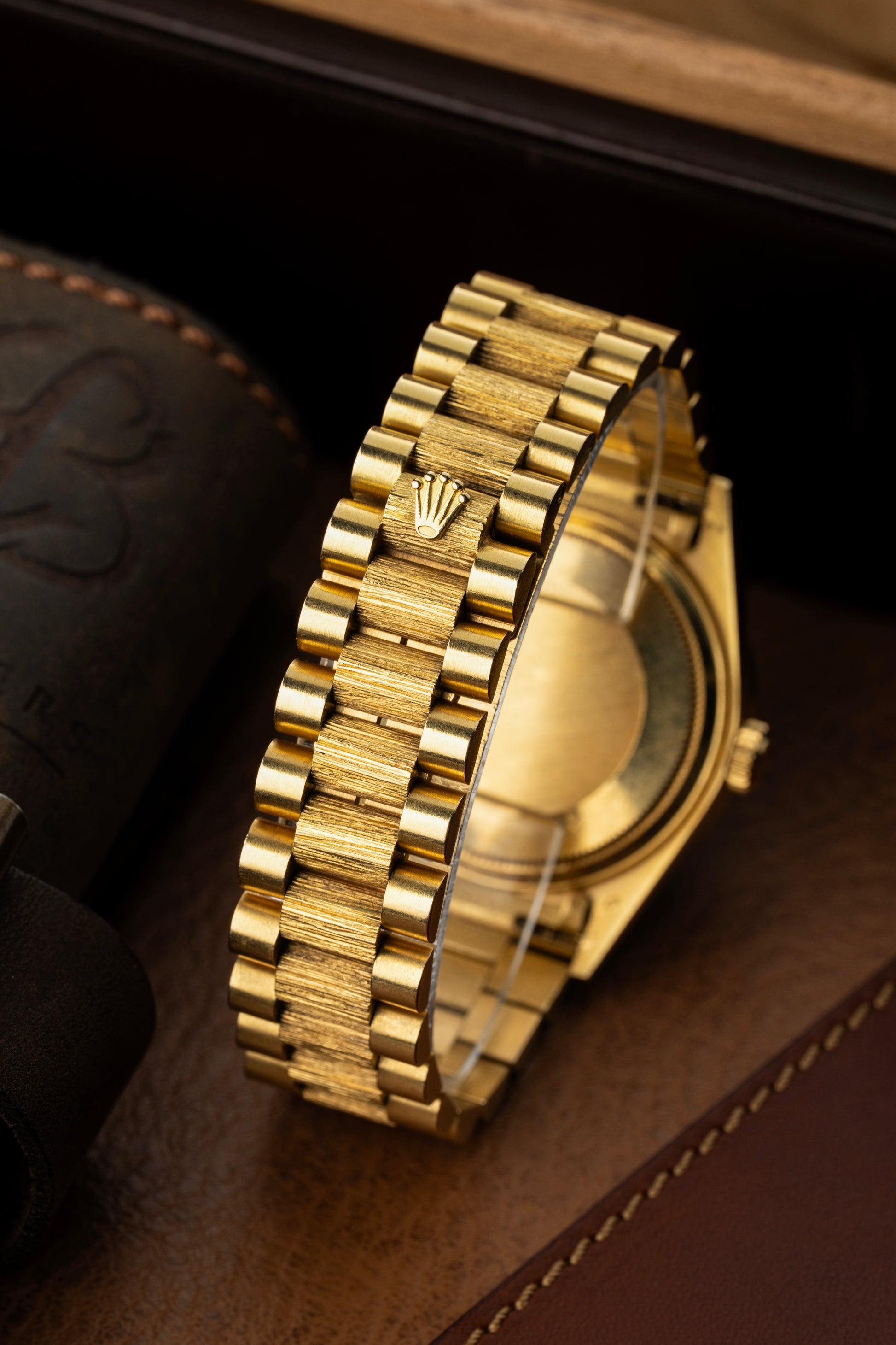 Rolex Day-Date "Bark" watches are a distinct variation of the iconic Rolex Day-Date model. The "Bark" nickname refers to the unique texture which resembles the bark of a tree. This texture can be seen on the bezel and the centre links of the president bracelet. The pattern is created through a specialized technique that gives the watch a distinctive and tactile aesthetic.