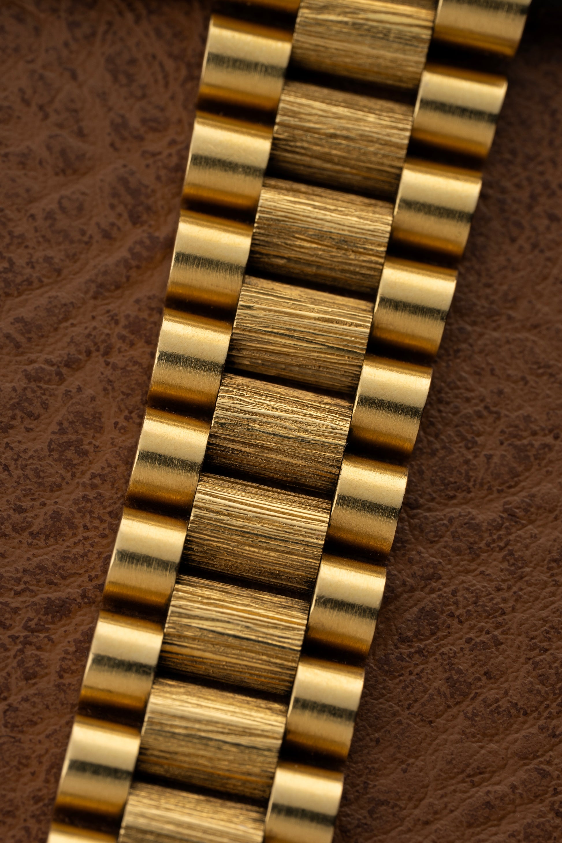 The watch comes equipped with the iconic President bracelet which is an essential part of the Day-Date's identity and is synonymous with its reputation as a high-status timepiece. The President bracelet has a three-piece link design with the centre having the Bark finish to match the Bark bezel.