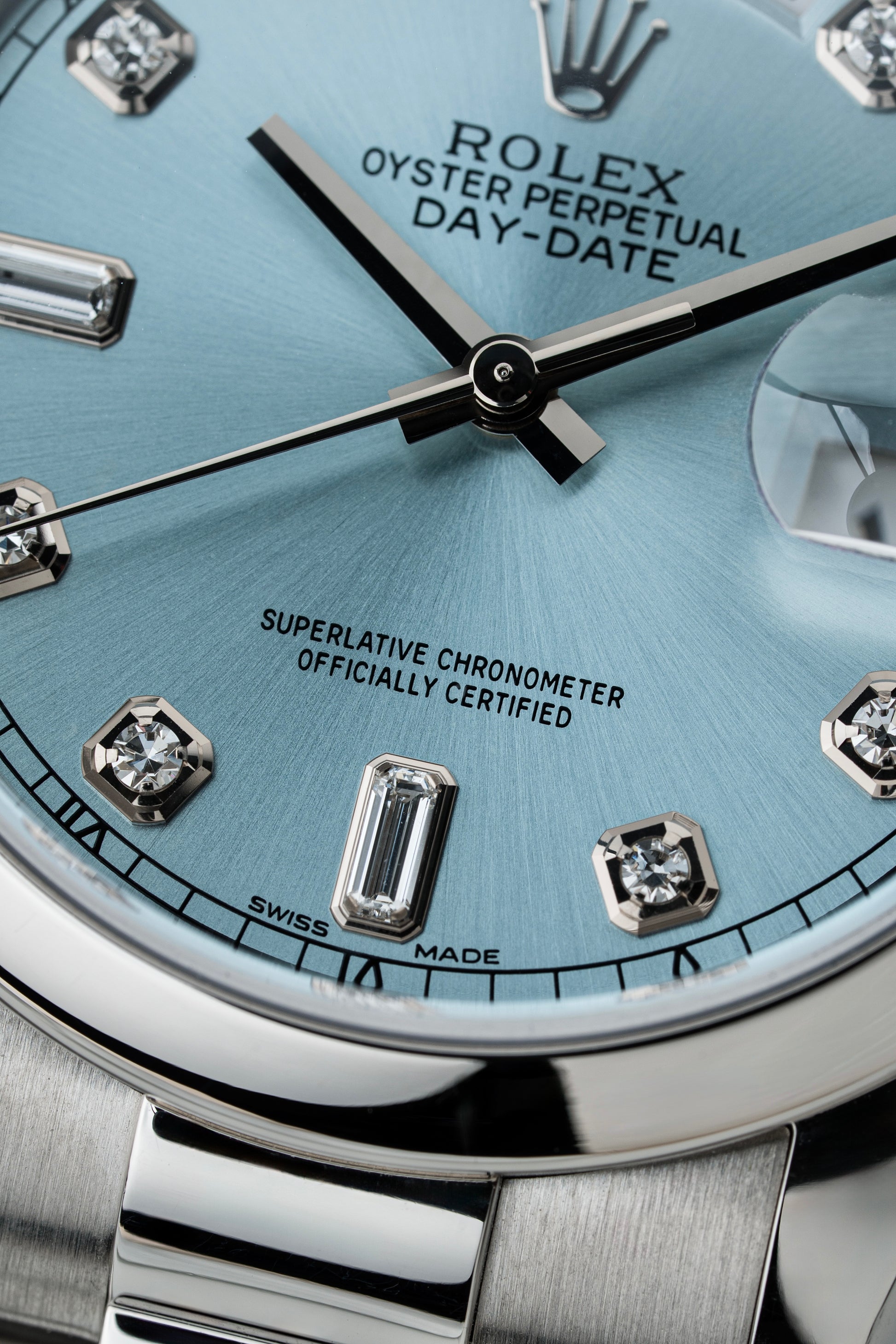 The ice blue dial is reserved only for platinum watches in the Rolex line-up, making it a symbol of refinement and a statement piece tied directly to the exclusivity of platinum watches. This subtle identifier helps to set the 118206 platinum Day-Date apart from other seemingly similar white-gold variations.