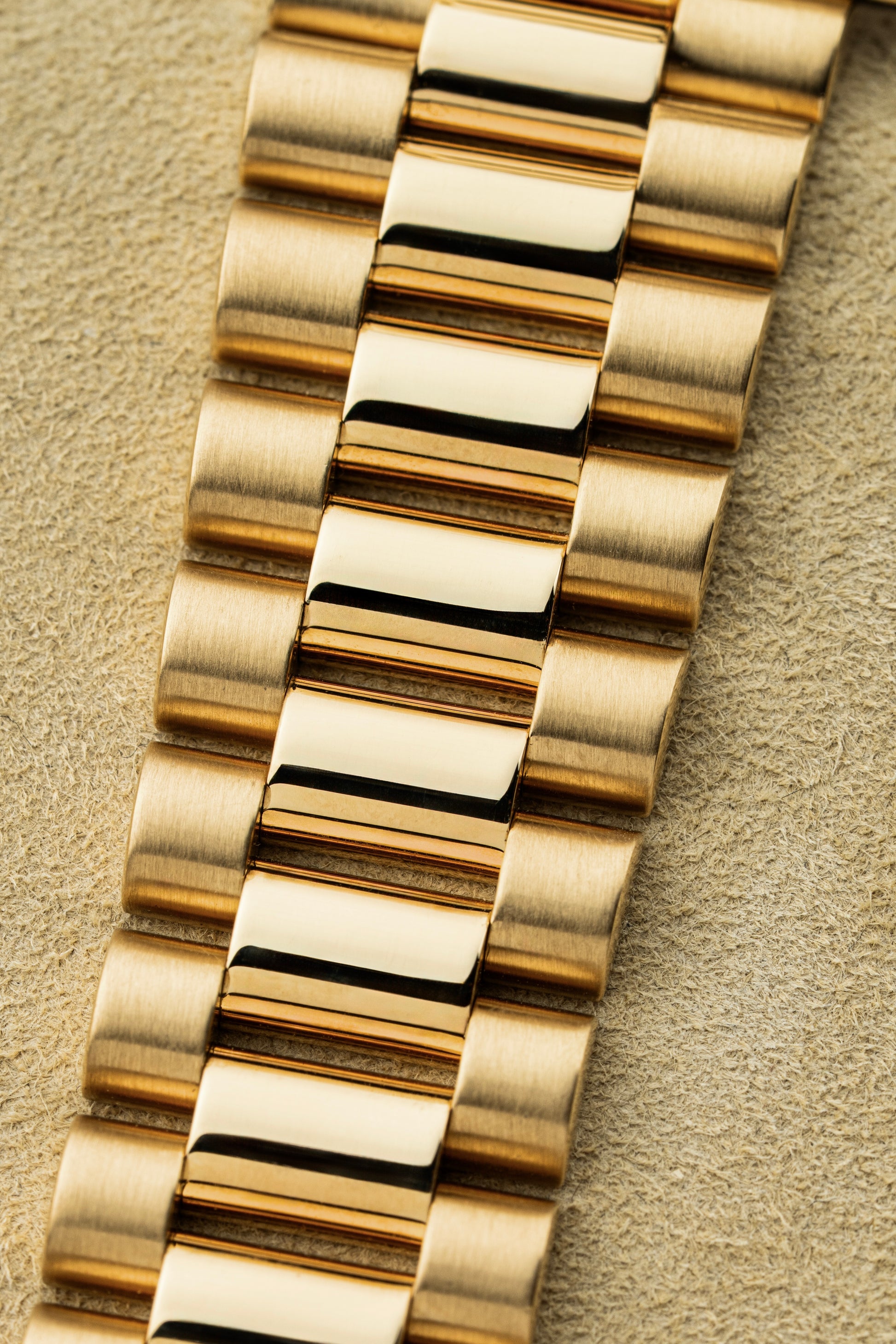 The watch comes fitted with the renowned President bracelet with the upgraded solid-link design which means that each link is made from a single piece of metal, providing greater weight and a more substantial feel. The solid-links enhance the bracelet's durability and longevity, making them more resistant to wear and tear, and contribute to a more luxurious and premium feel on the wrist.