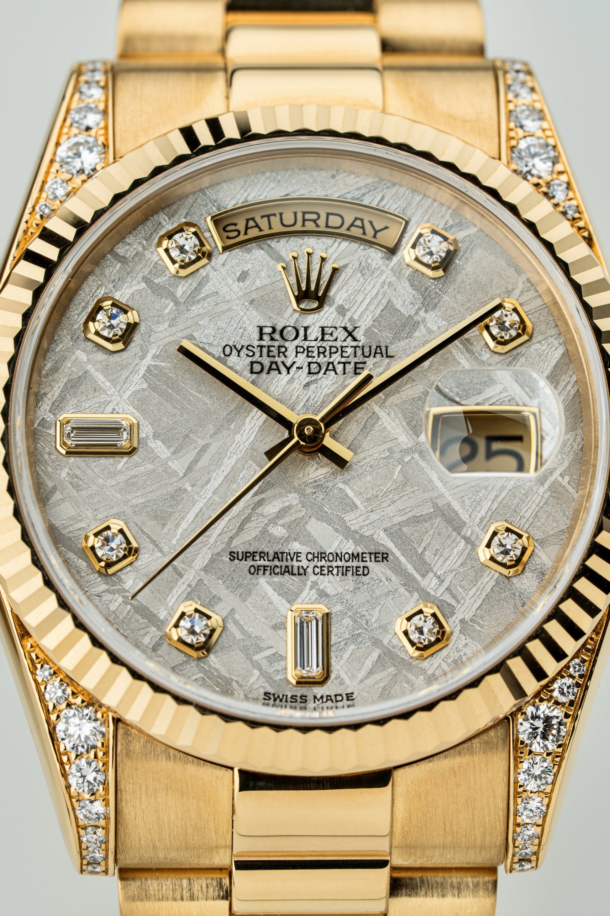 For sale is a Stunning Rolex Day-Date 36mm Ref. 118338 with factory-set diamond lugs and an exceptionally rare meteorite dial with factory-set diamond and baguette hour markers.