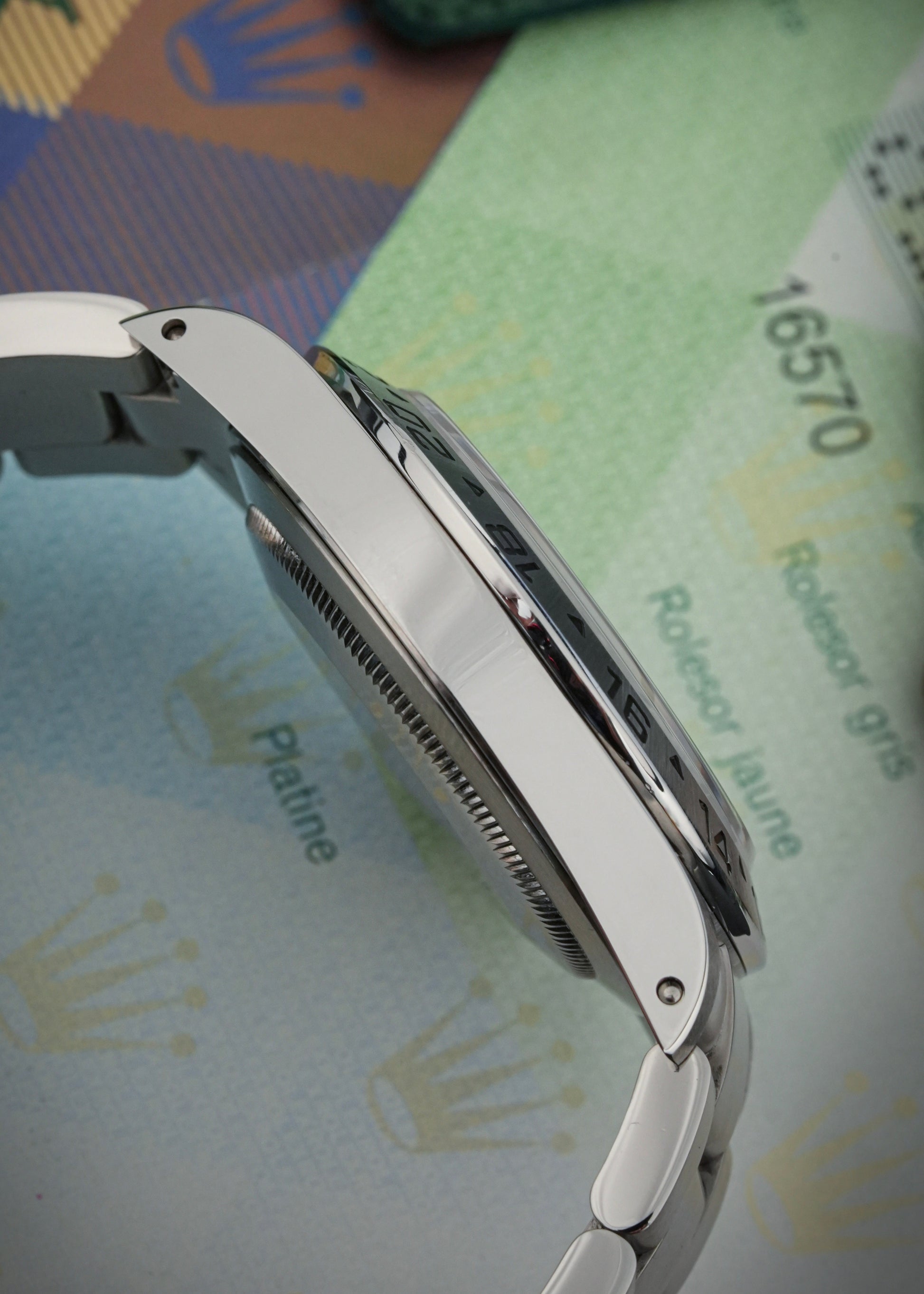 This example features a 40mm stainless steel case, crafted from Rolex’s corrosion-resistant 904L steel, offering superior durability and a refined finish. The case retains sharp lines and strong lugs, reflective of its immaculate condition.