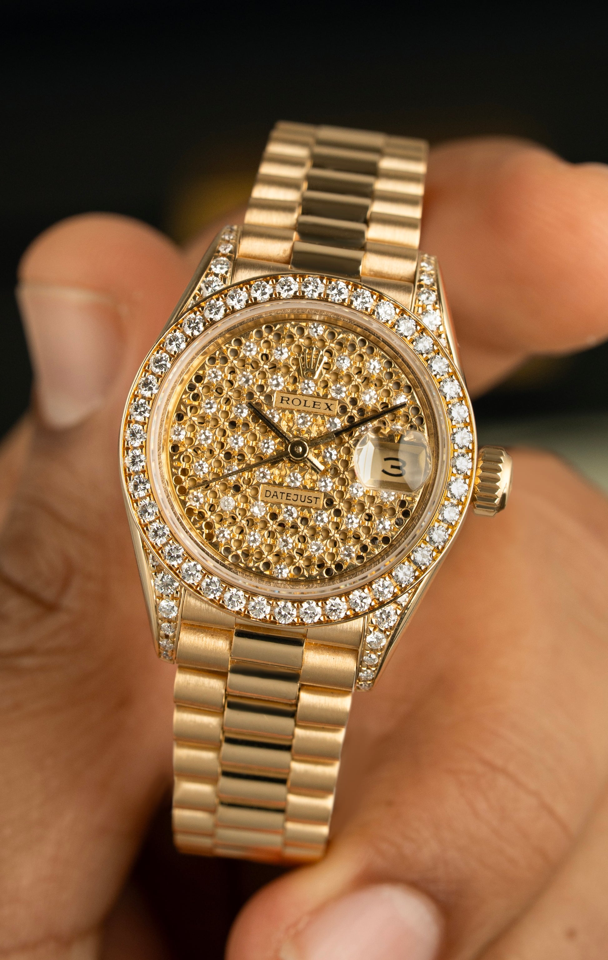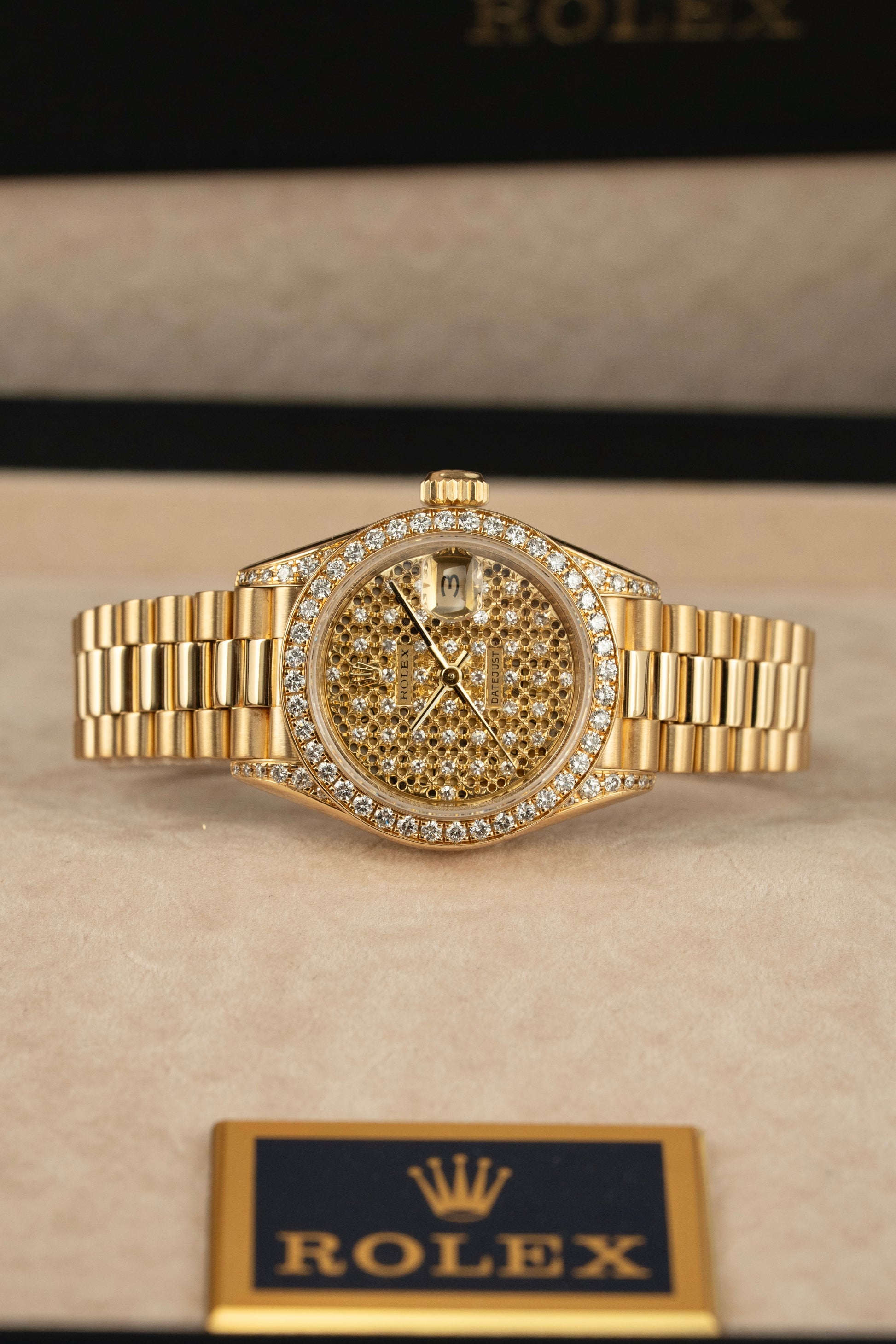Watches of this caliber—particularly featuring the rare honeycomb pavé dial—are virtually unobtainable on the open market today. This Lady-Datejust Ref. 69158 represents not only a pinnacle of Rolex craftsmanship but also an enduring symbol of elegance and exclusivity.